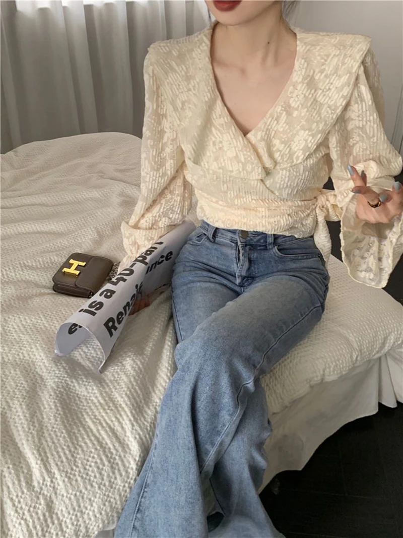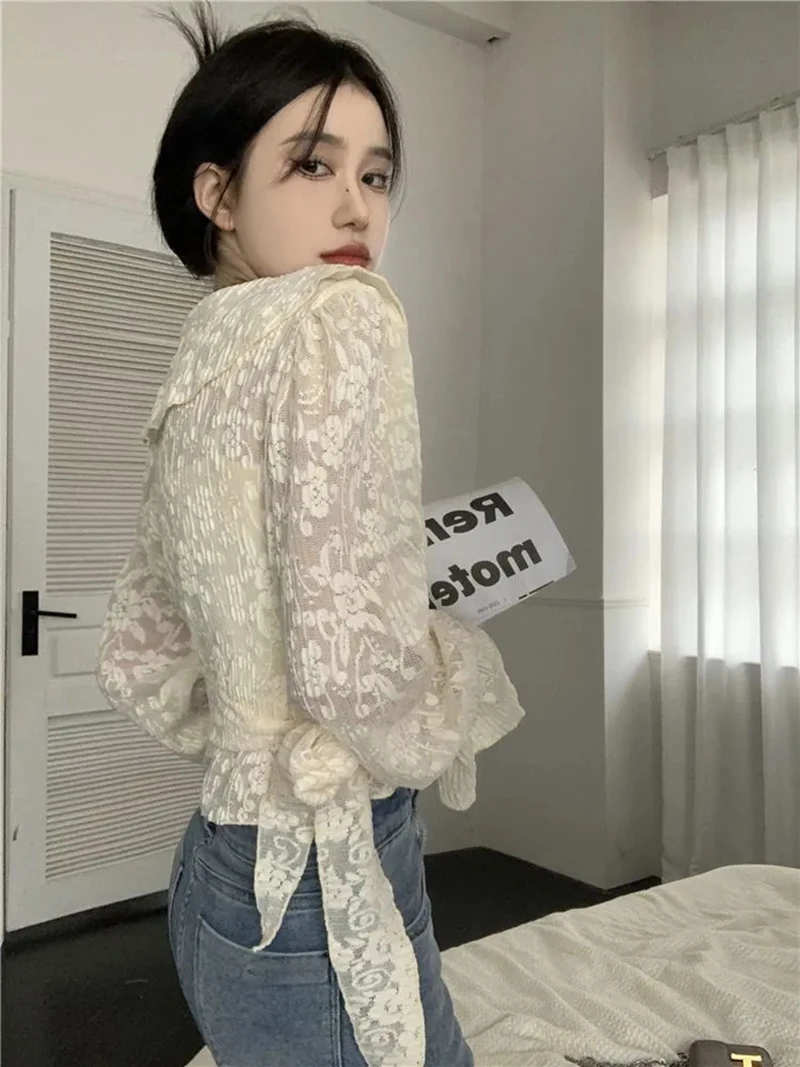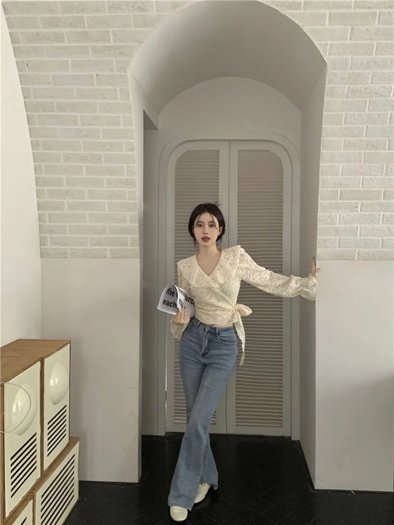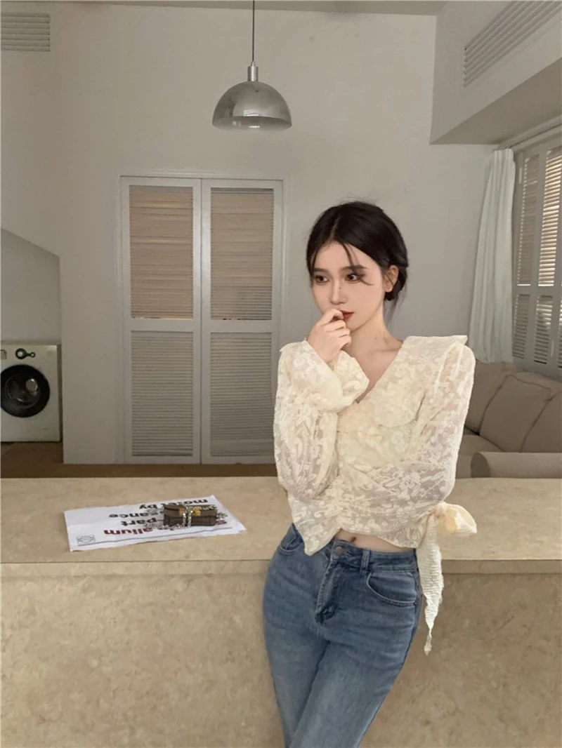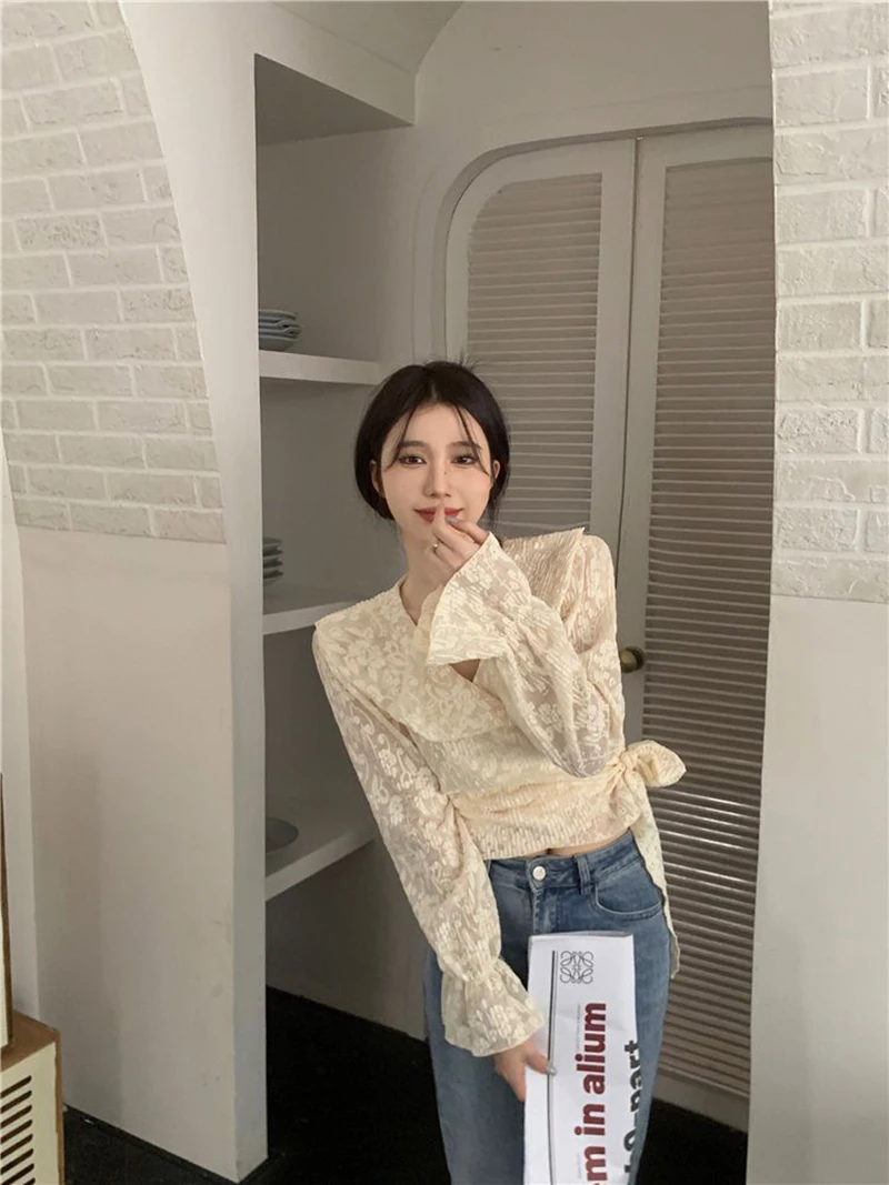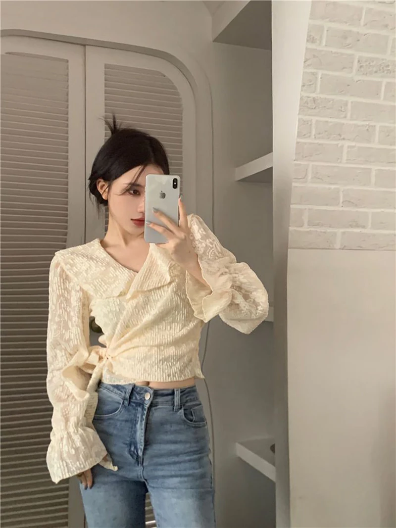 Lunivop Elegant Lace Cropped Blouses Women Vintage Bandage Long Sleeve Shirts Korean Designer Simple V Neck Slim Crop Tops New