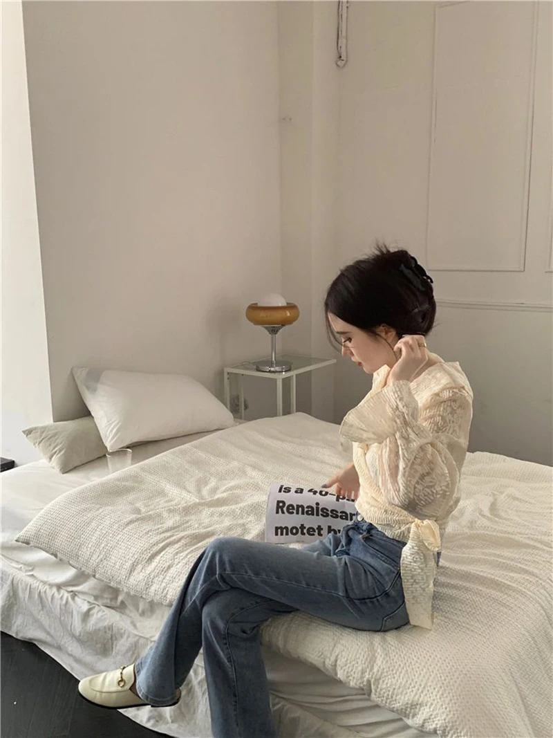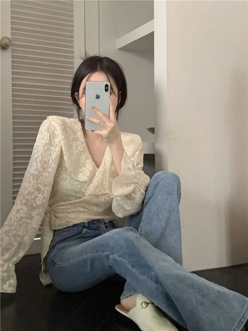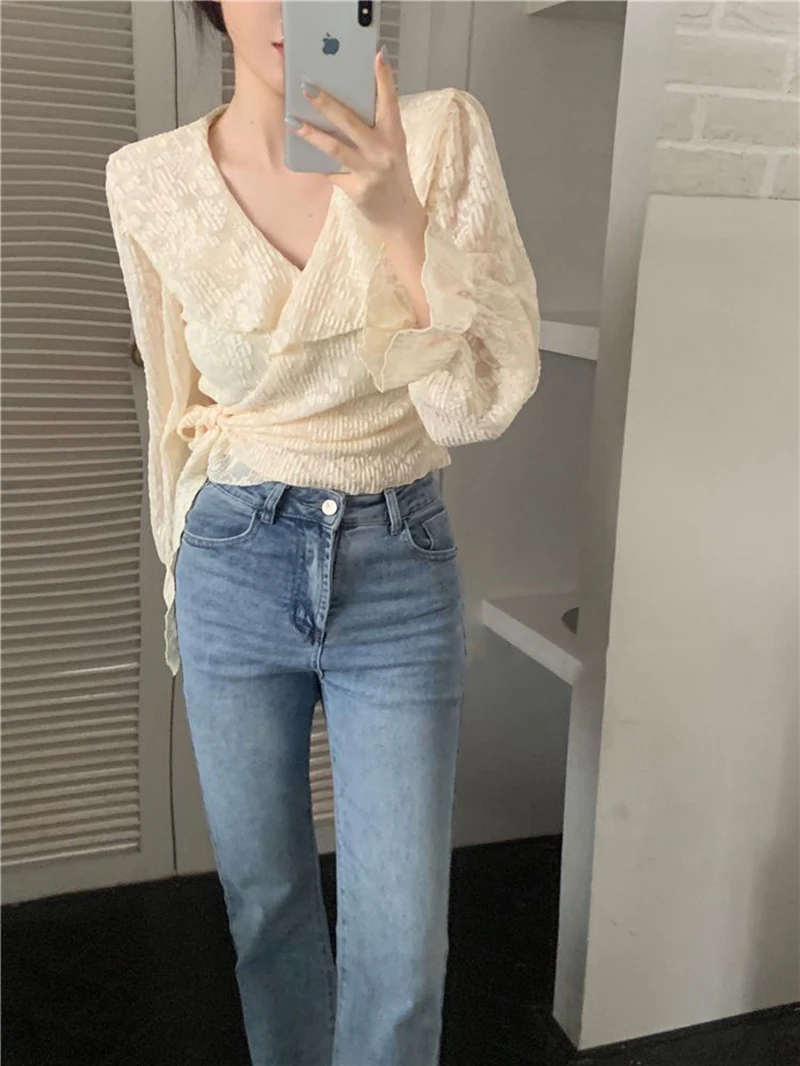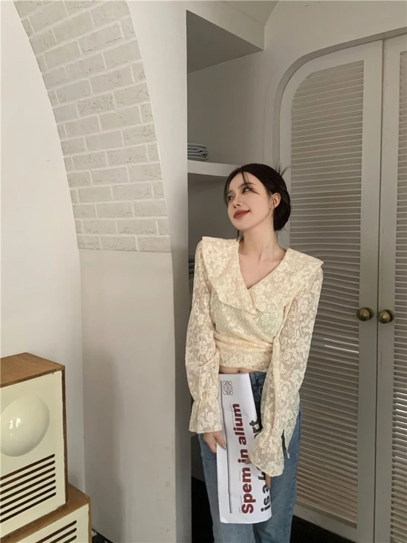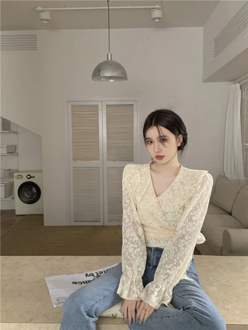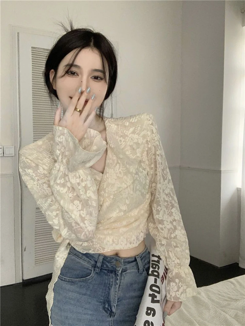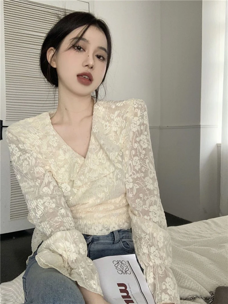 Lunivop Elegant Lace Cropped Blouses Women Vintage Bandage Long Sleeve Shirts Korean Designer Simple V Neck Slim Crop Tops New