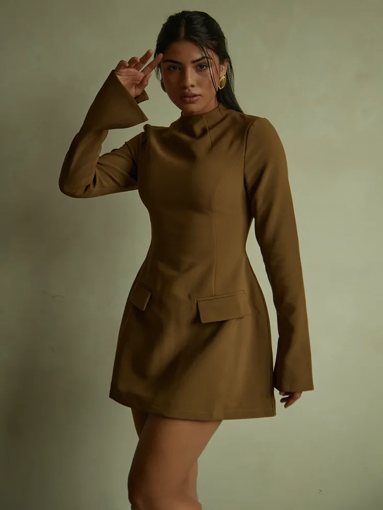 Lunivop Elegant Long Sleeve Slim Mini Dress For Women A-Line High Waist Two Pockets Solid Autumn Winter New Party Dress Female
