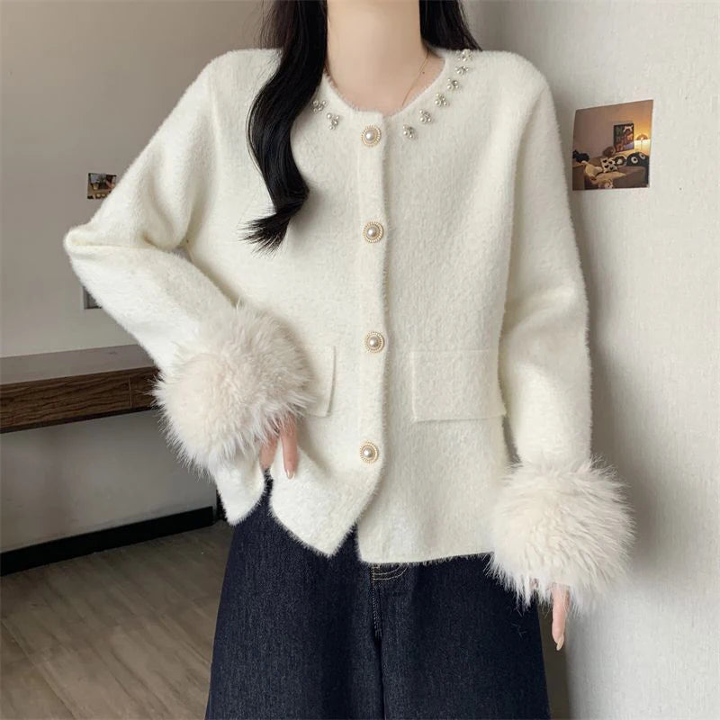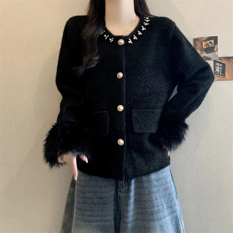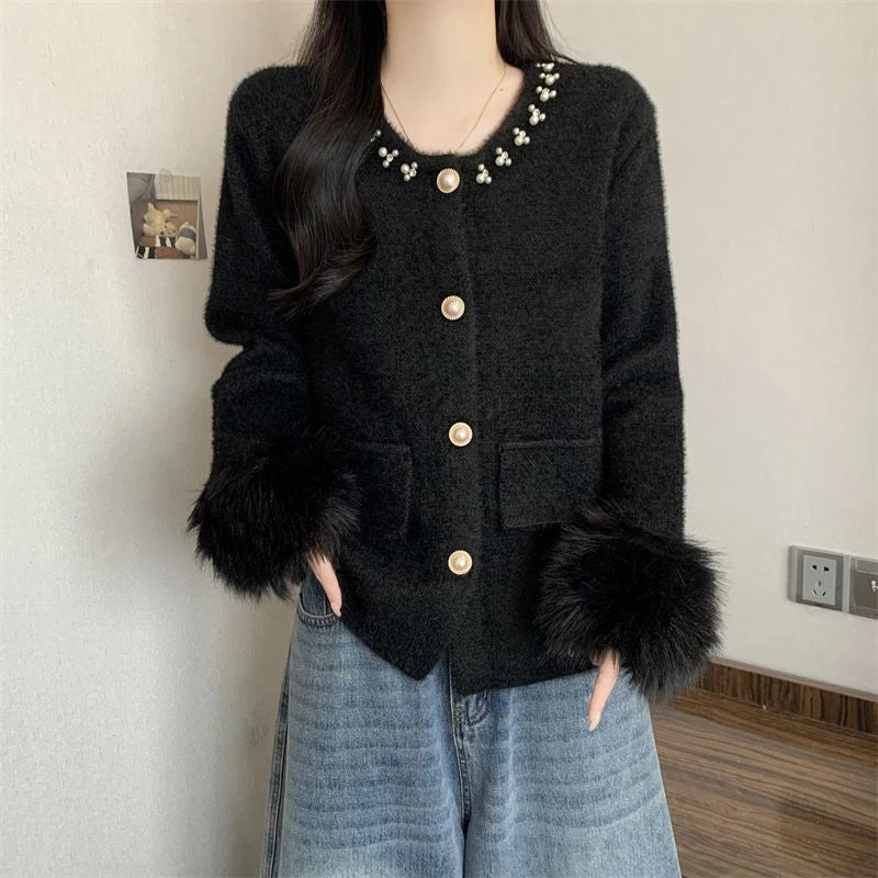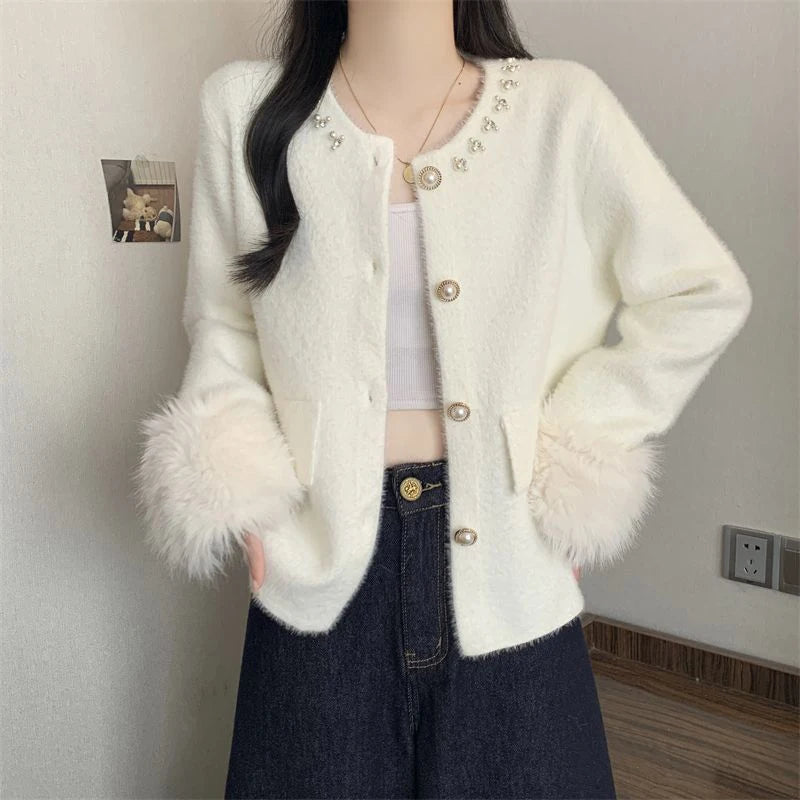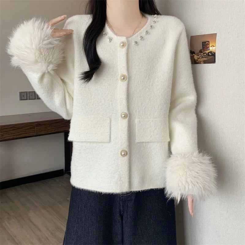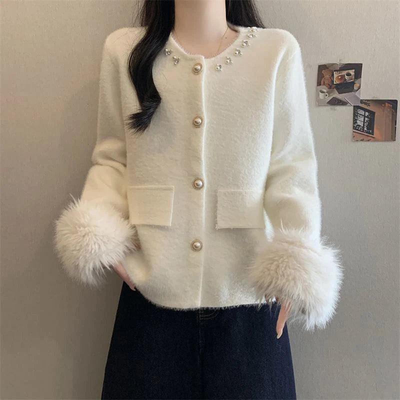 Lunivop Elegant Pearls Sweet Cardigan Women Vintage O Neck Faux Mink Cashmere Knitted Sweaters Korean Casual Long Sleeve Loose Tops