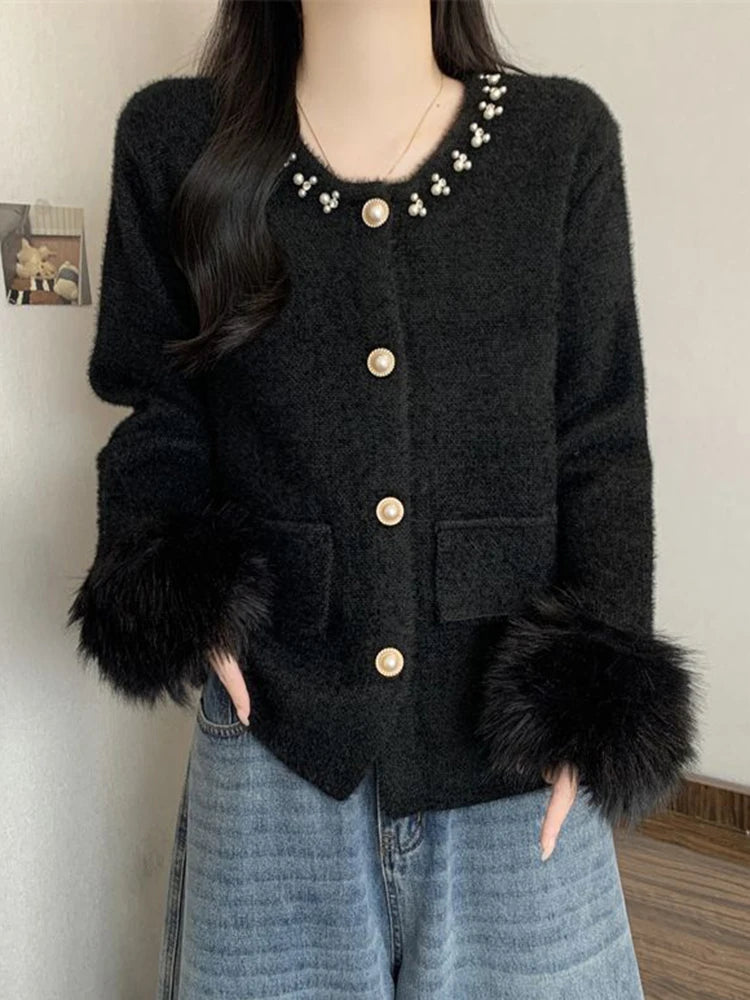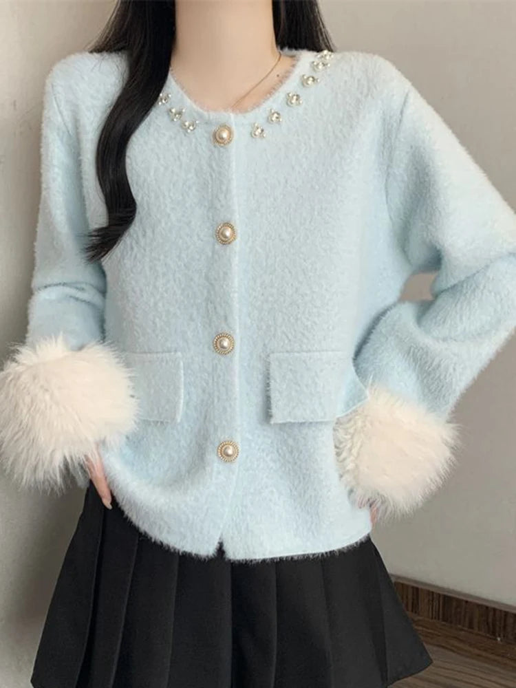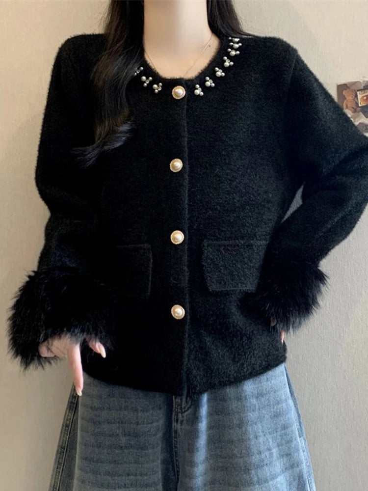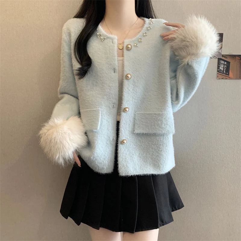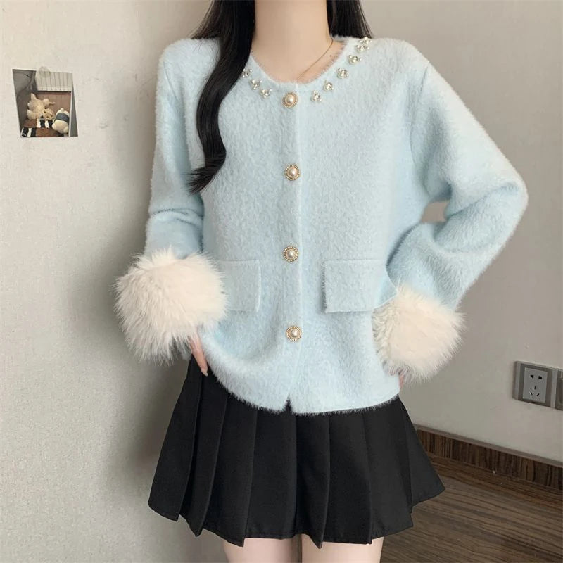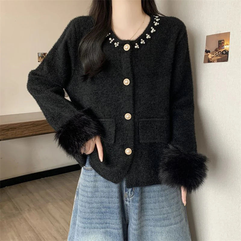Lunivop Elegant Pearls Sweet Cardigan Women Vintage O Neck Faux Mink Cashmere Knitted Sweaters Korean Casual Long Sleeve Loose Tops