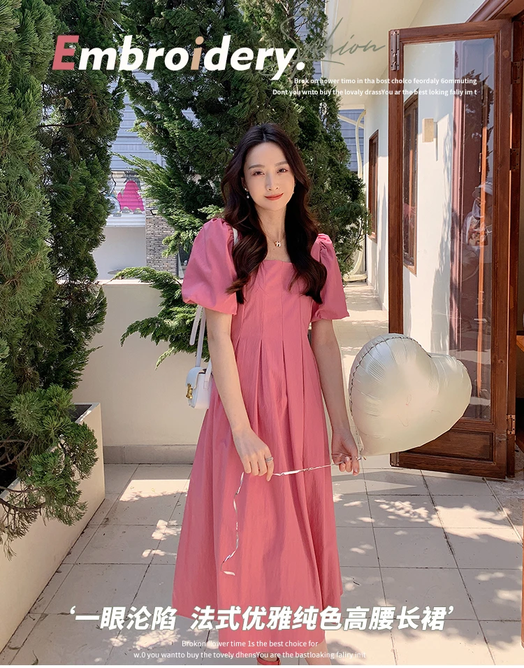Lunivop Elegant Pink Dress Summer Fashion Square Collar Puff Sleeve Ruffle Female Dresses Korea High Waist Party Women's Dress Vestidos