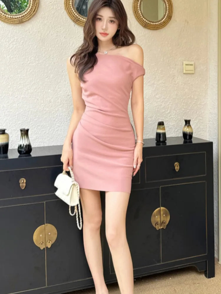 Lunivop Elegant Solid Bodycon Evening Party Dresses Fashion Diagonal Collar Off Shoulder Prom Vestidos Summer Korean Female Clothing