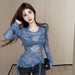 Lunivop Elegant Sweet Mesh Long Sleeve T-shirts Y2k Slim Fit Irregular Top for Women 2025 Spring New Bottoming Blue Tee Shirt