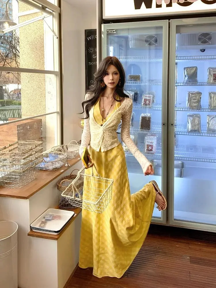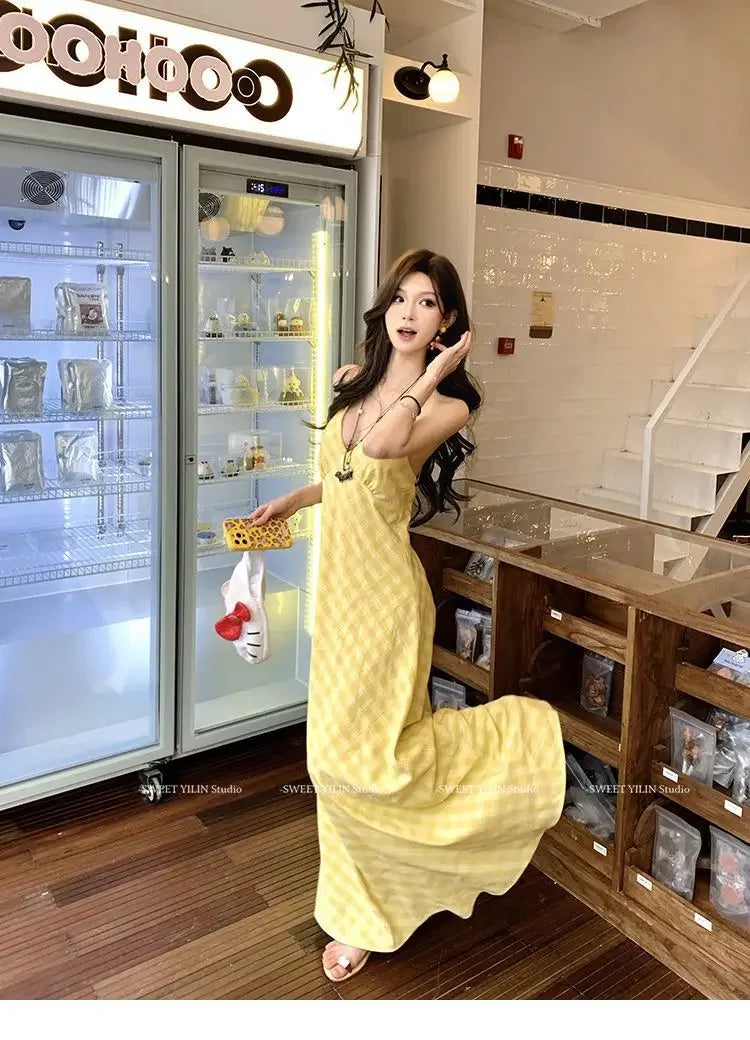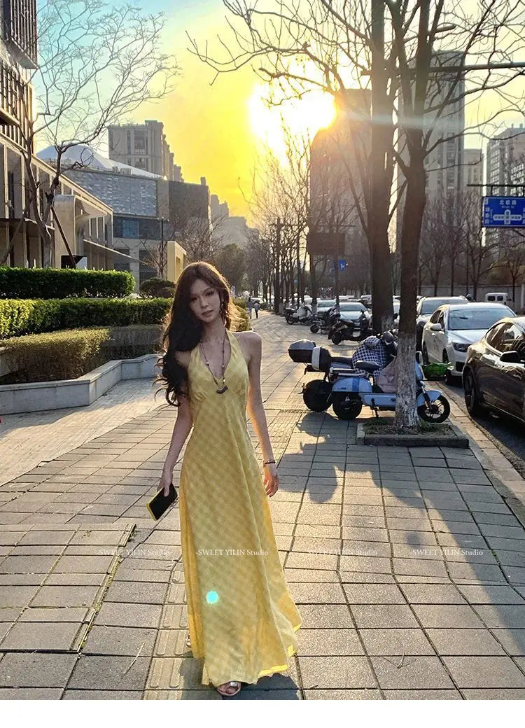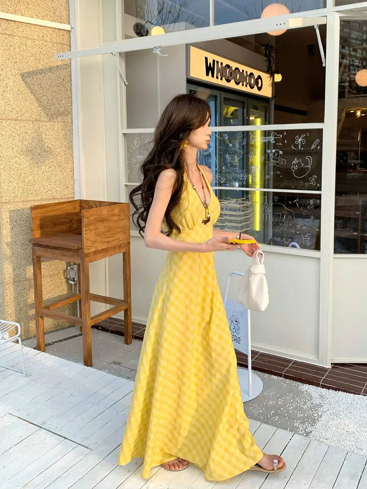 Lunivop Elegant Sweet V-neck Long Dress Women Butter Yellow Casual Sexy Beach Midi Dresses Korean Style Lace Up Dress Backless