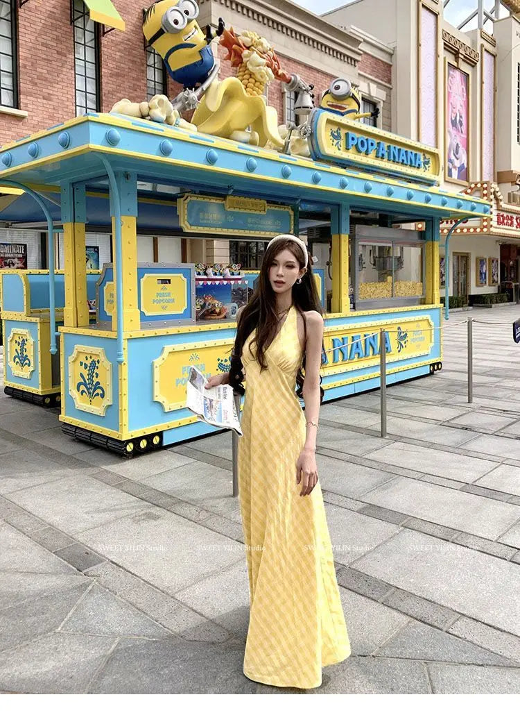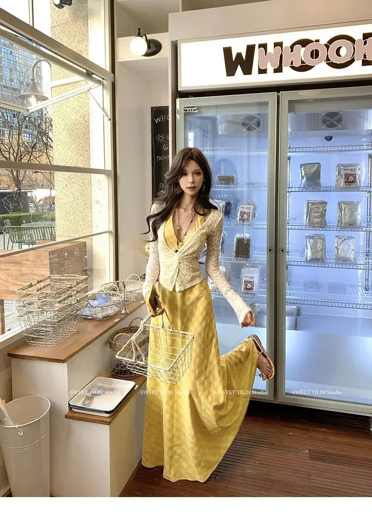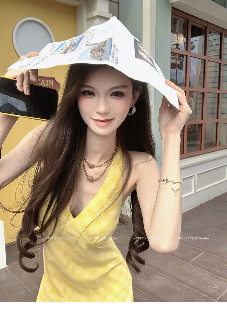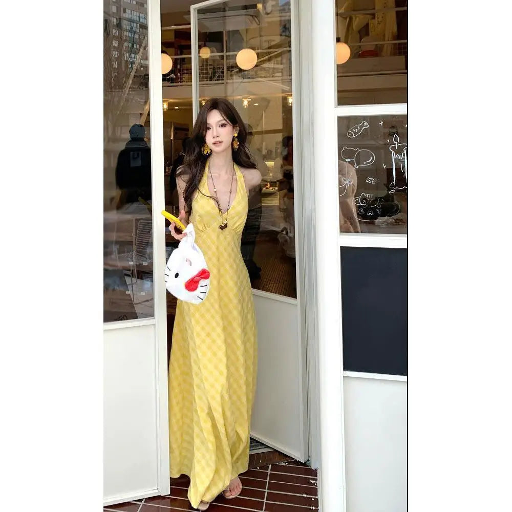 Lunivop Elegant Sweet V-neck Long Dress Women Butter Yellow Casual Sexy Beach Midi Dresses Korean Style Lace Up Dress Backless