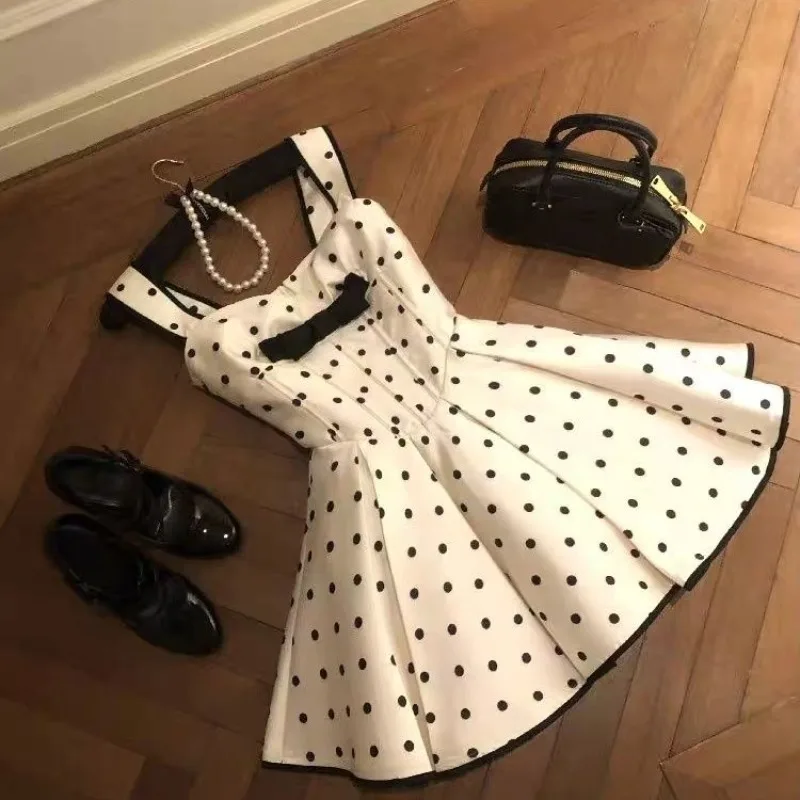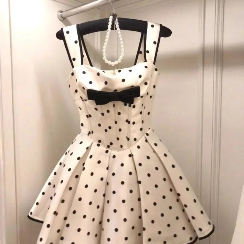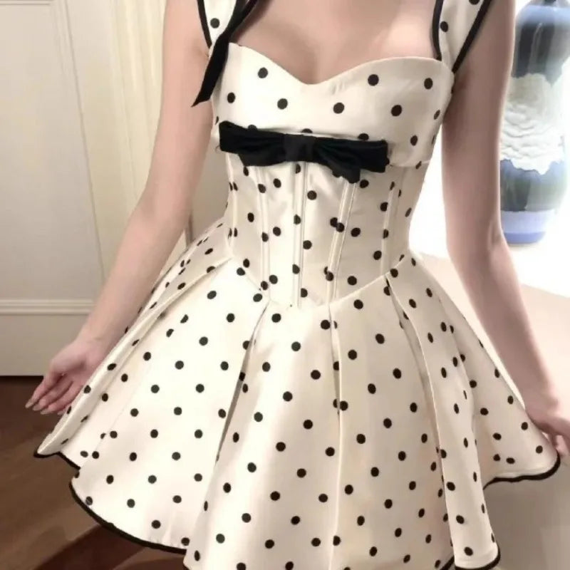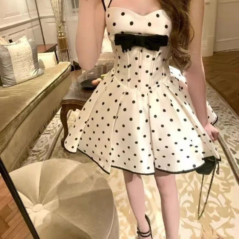 Lunivop Elegant Sweet Wave Point Bow Ruched A-line Dresses 2025 New Camisole Vest Dress for Women Y2k Slim Waist Vestidos De Mujer