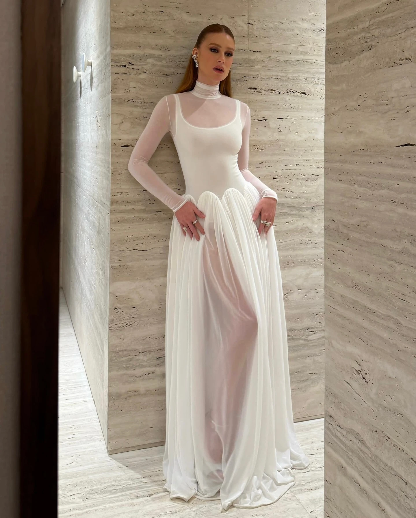 Lunivop Elegant Tulle Long Wedding Dresses High Collar Draped Simlpe Prom Dresses Formal Full Sleeves Illusion Bridal Gowns Customized