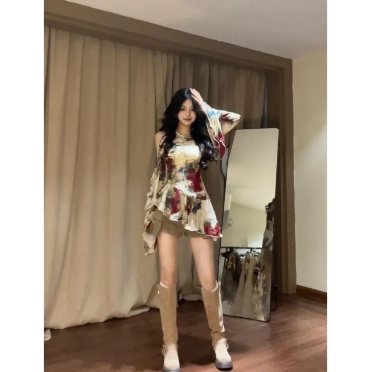 Lunivop Elegant Vintage Oil Painting Blouses 2025 Summer New Shirts Women Irregular Skew Collar Off Shoulder Blusas De Mujer
