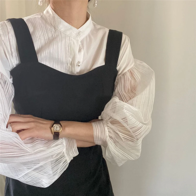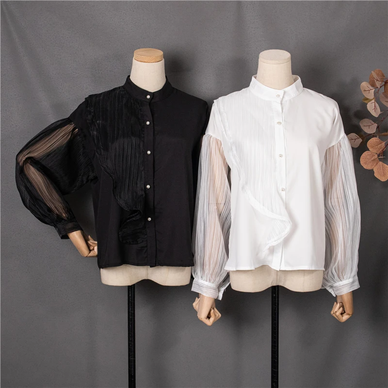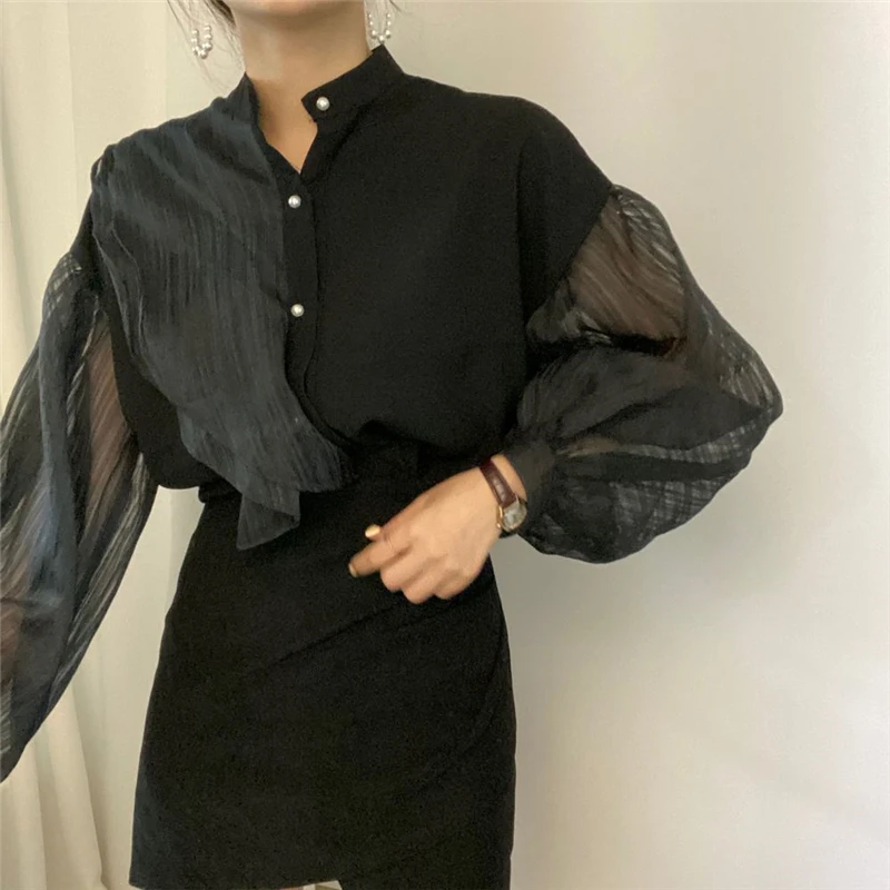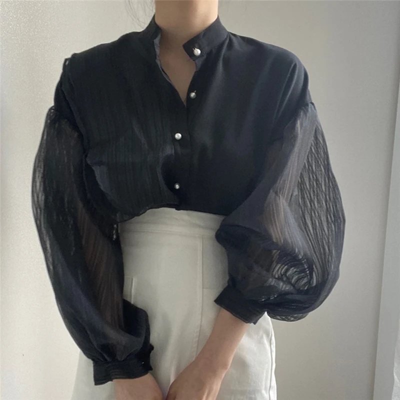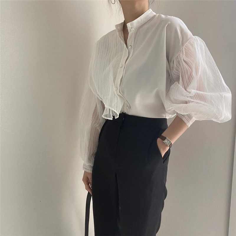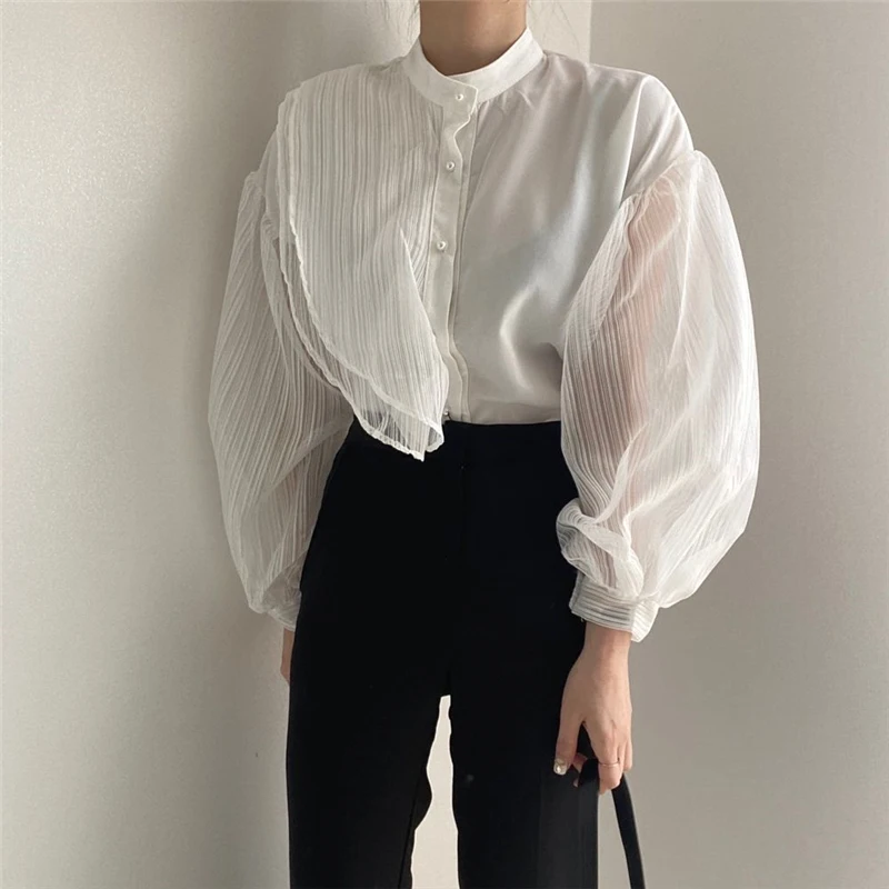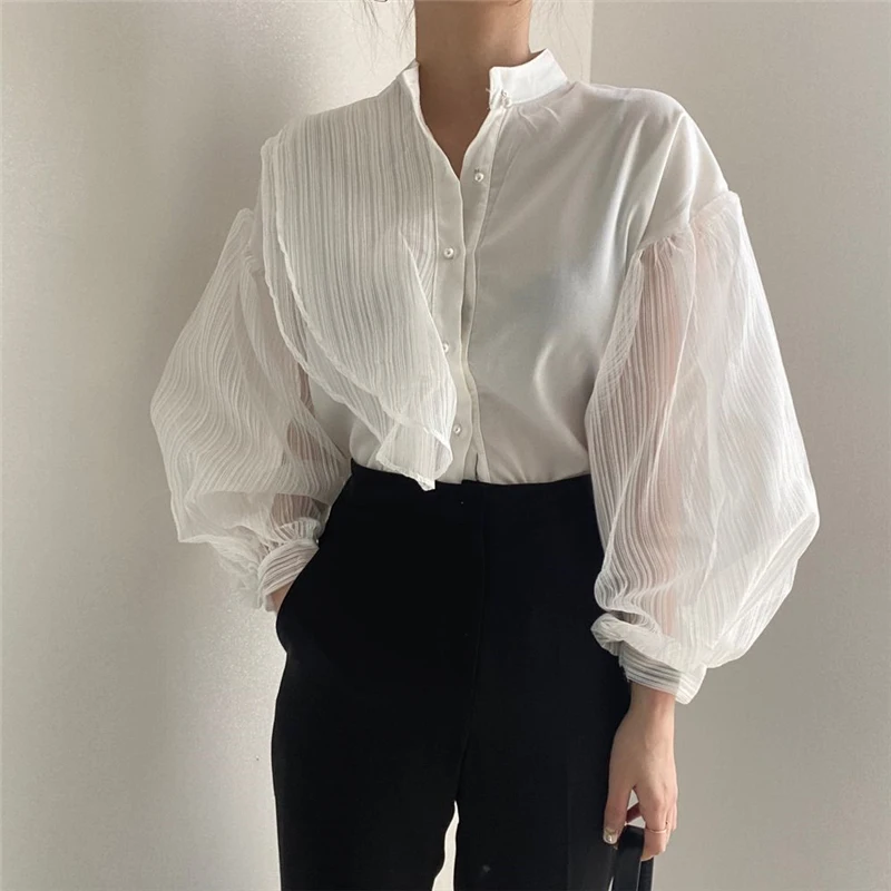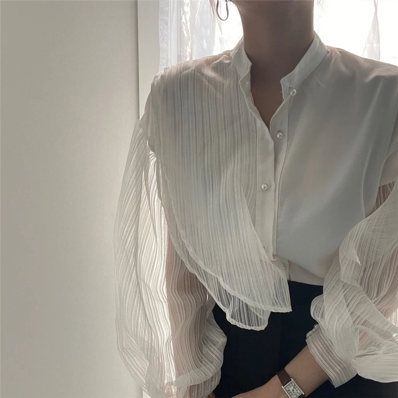 Lunivop Elegant White Shirts Women Vintage Mesh Patchwork Long Sleeve Blouses Summer Ladies Korean Black Tulle Sheer Chic Tops New