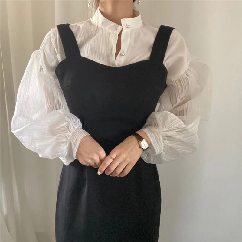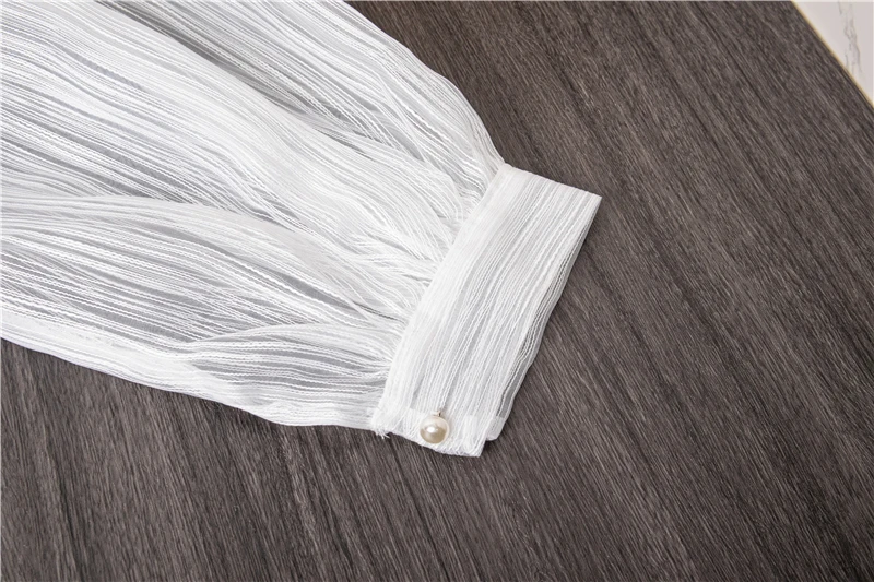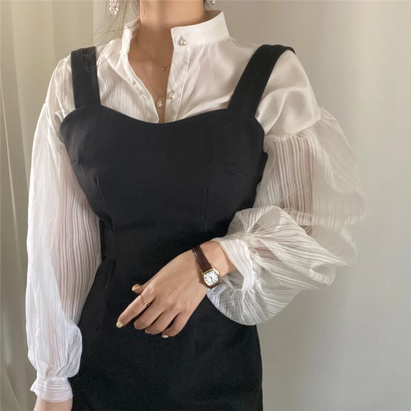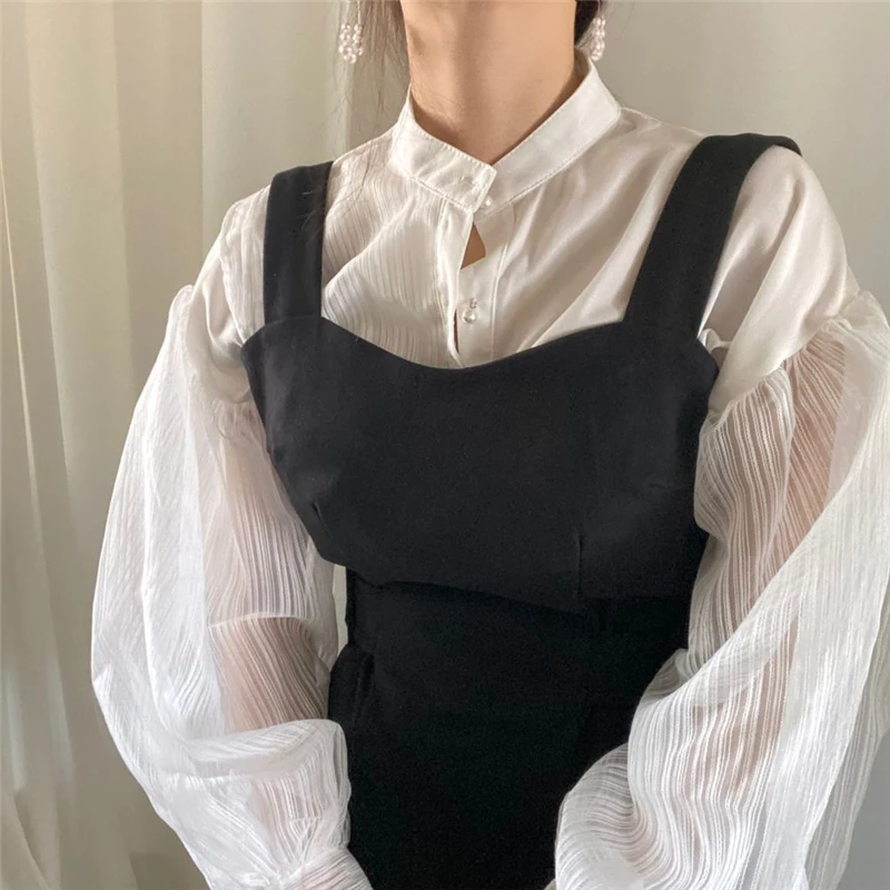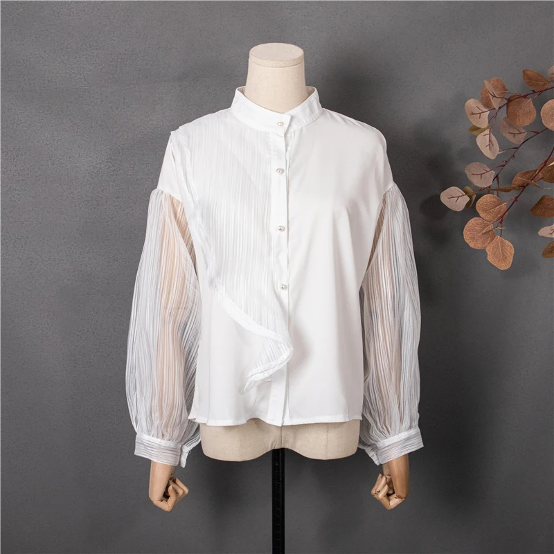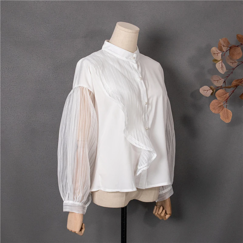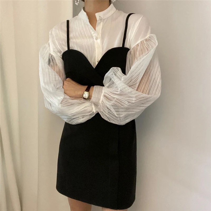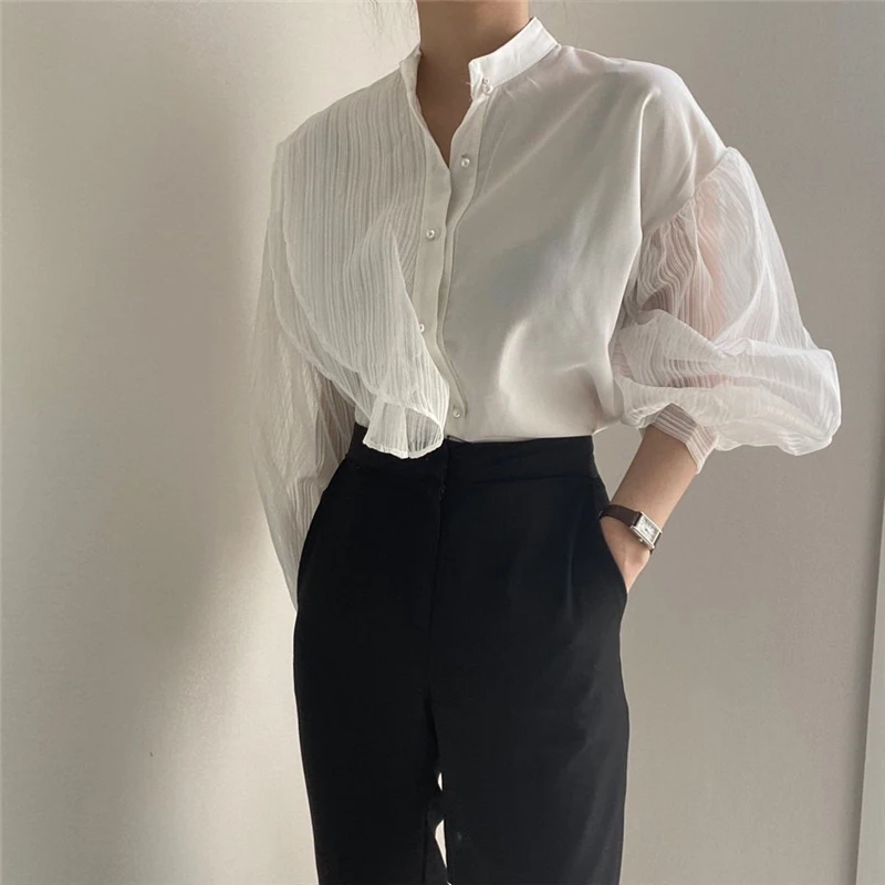 Lunivop Elegant White Shirts Women Vintage Mesh Patchwork Long Sleeve Blouses Summer Ladies Korean Black Tulle Sheer Chic Tops New