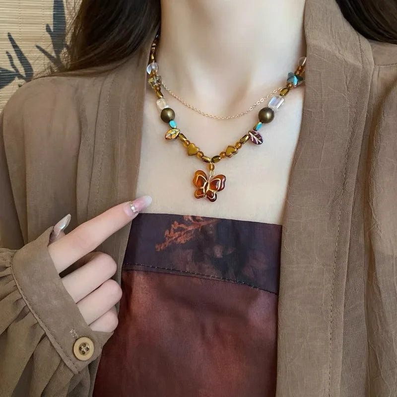Lunivop Ethnic Style Retro Butterfly Pendant Necklace Geometric Bead Clavicle Sweater Chain Jewelry