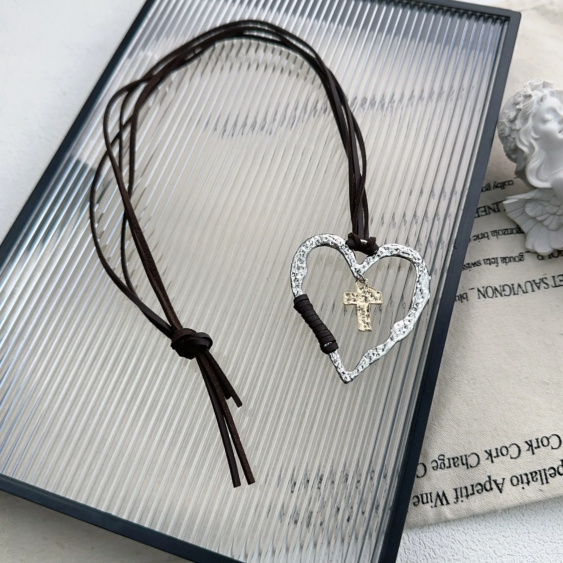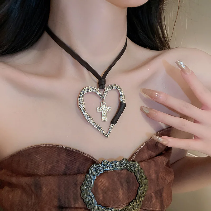 Lunivop Exaggerated Ethnic Big Hollow Love Heart Cross Jesus Pendant Choker Necklace for Women Goth Adjustable Rope Chain Y2K Jewelry