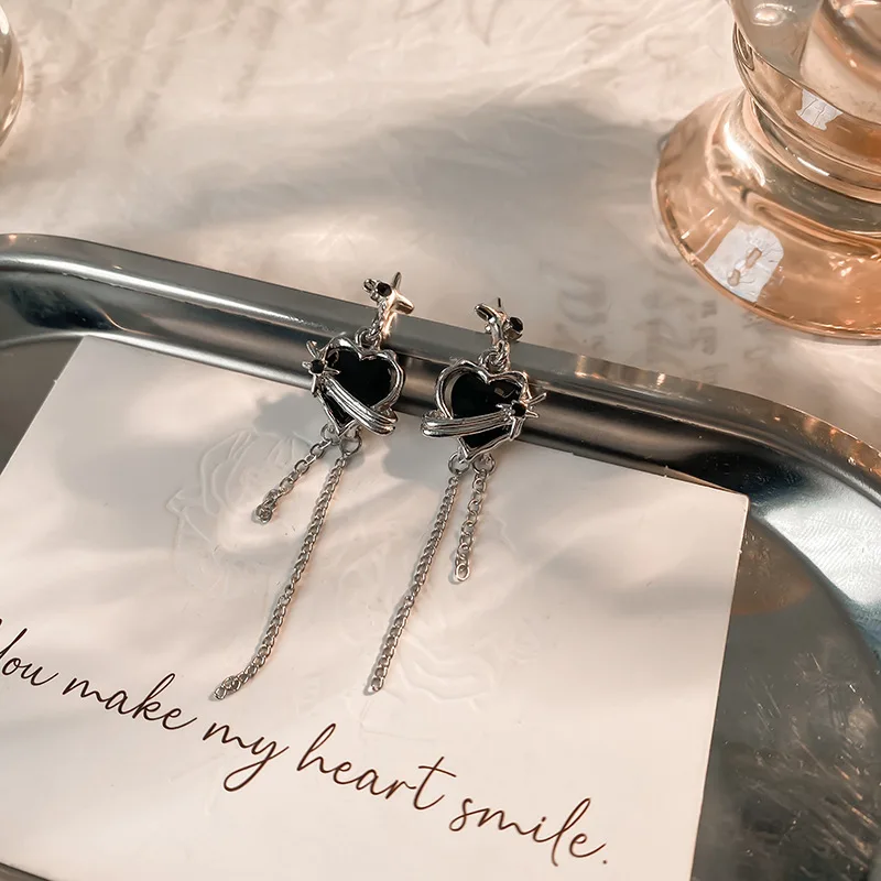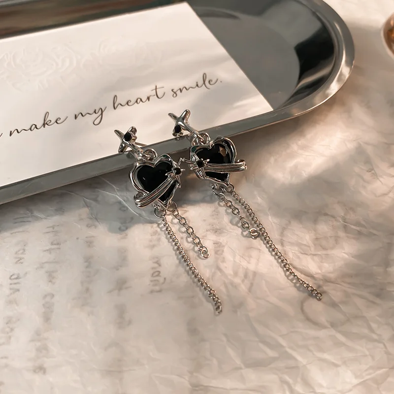 Lunivop Exquisite Black Crystal Heart Dangle Earrings for Women Charm Lava Shining Star Long Tassel Earrings Fashion Jewelry Accessories