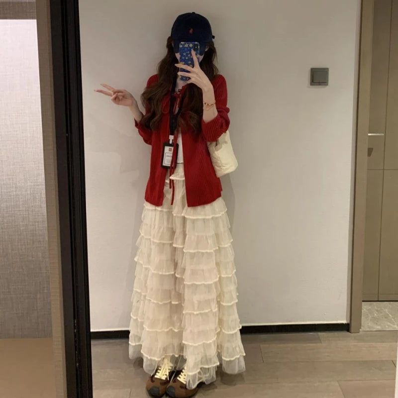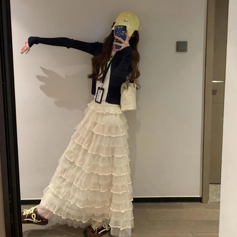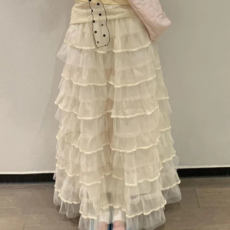 Lunivop Fairycore Sweet Cake Skirts Women Kawaii Korean Style Ruffle Long Skirt Elegant Cutecore High Waist Mesh Layered Skirt