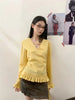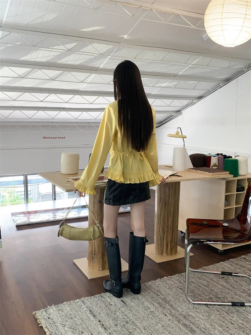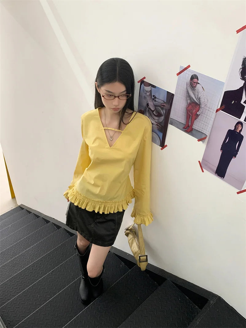 Lunivop Fall 2025 Fashion Woman Yellow Long Sleeve Blouse Ruffles Flare Sleeve V Neck Fashion Top Ladies Blouses Autumn Clothes