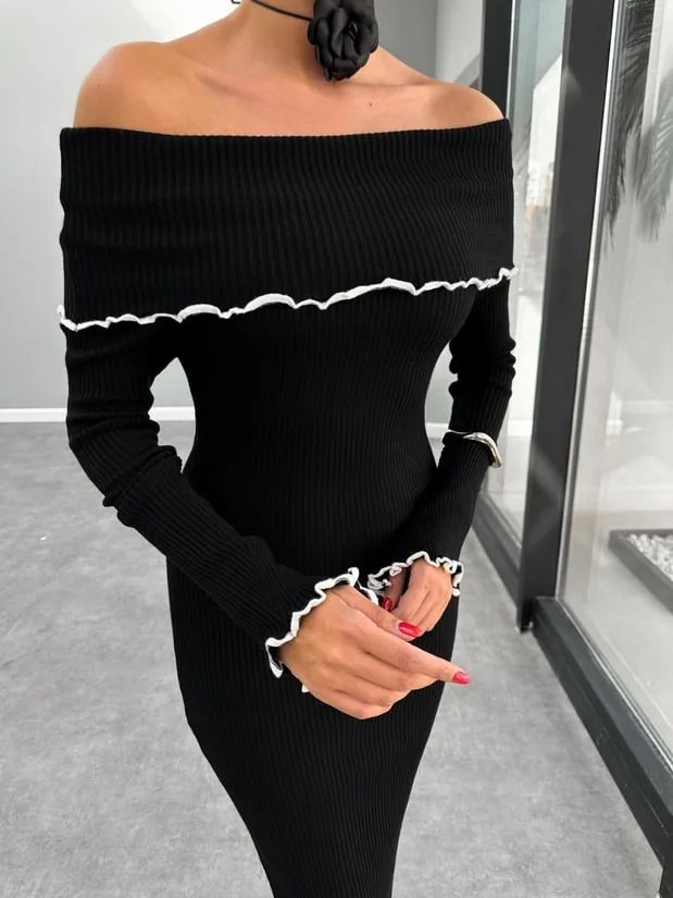 Lunivop Fall Winter Sexy One-Shoulder Long Knit Dress Slim Elegant Fungus Splice Contrast Color Sweater Female Club Party Dresses