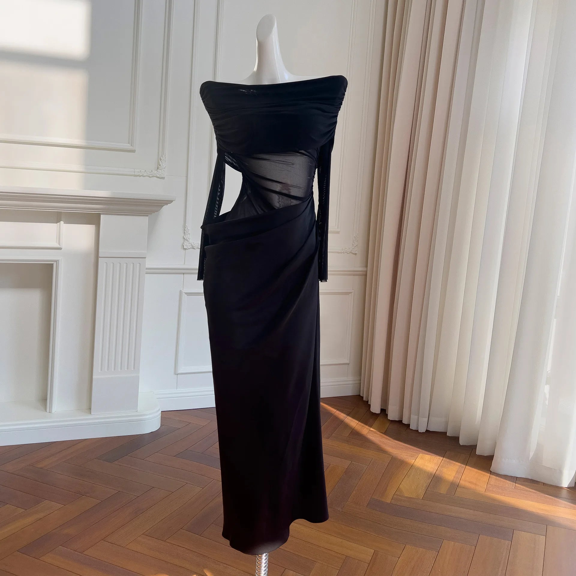 Lunivop Fashion Mesh Hollow Out Dress Women's Slash Neck Long Sleeve Waist Retraction Dresses 2025 Summer New Tide