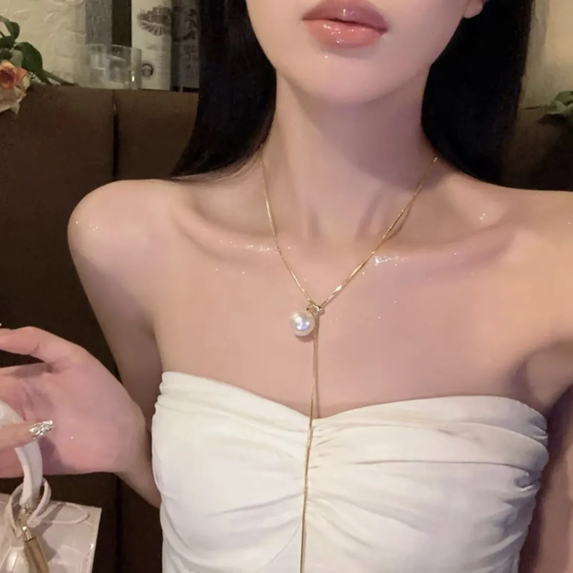 Lunivop Fashion Silver Color Pearl Tassel Necklace For Women Simple Metal Snake Bone Chain Pull Adjustable Sweater Chain Jewelry Gifts