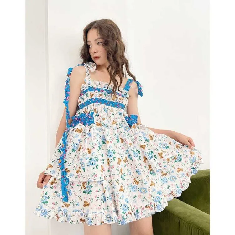 Lunivop Fashion Sweet Flower Print Dress for Women Summer New Bow Lace Upstrap Dresses Y2k E-Girl Slim Waist Ruched Vestidos Mujer