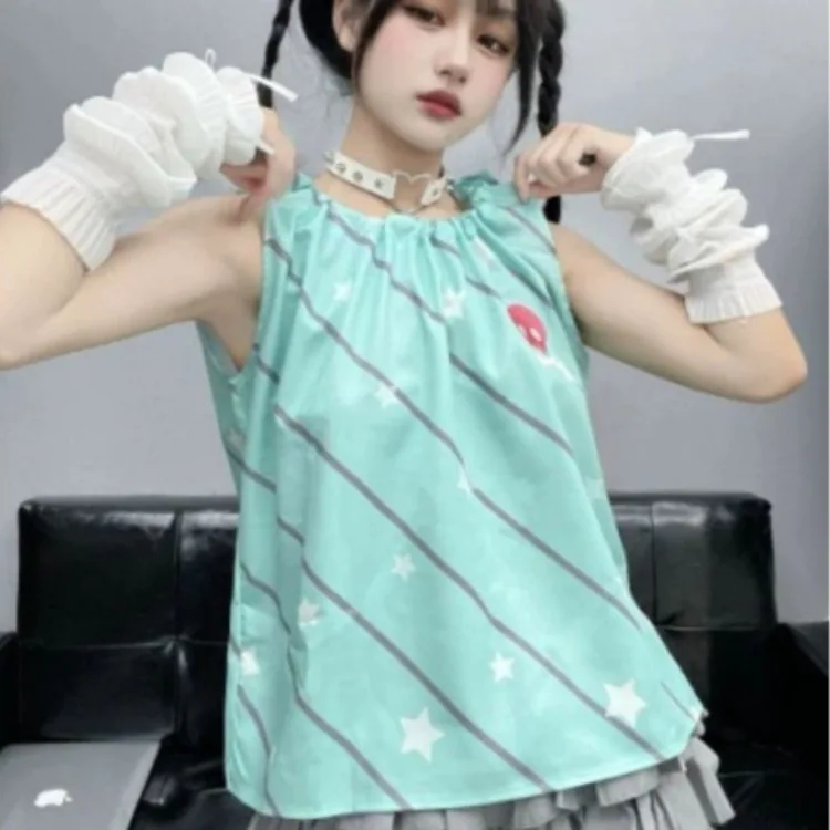 Lunivop Fashion Sweet Striped Star Vest for Women 2024 Summer New Loose Tank Top Y2k E-Girl O-neck Sleeveless Ruched Tops Mujer
