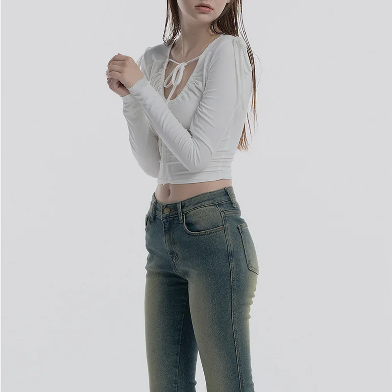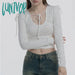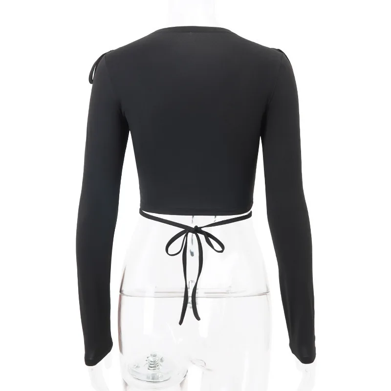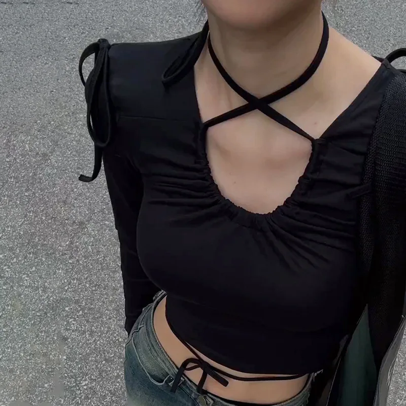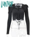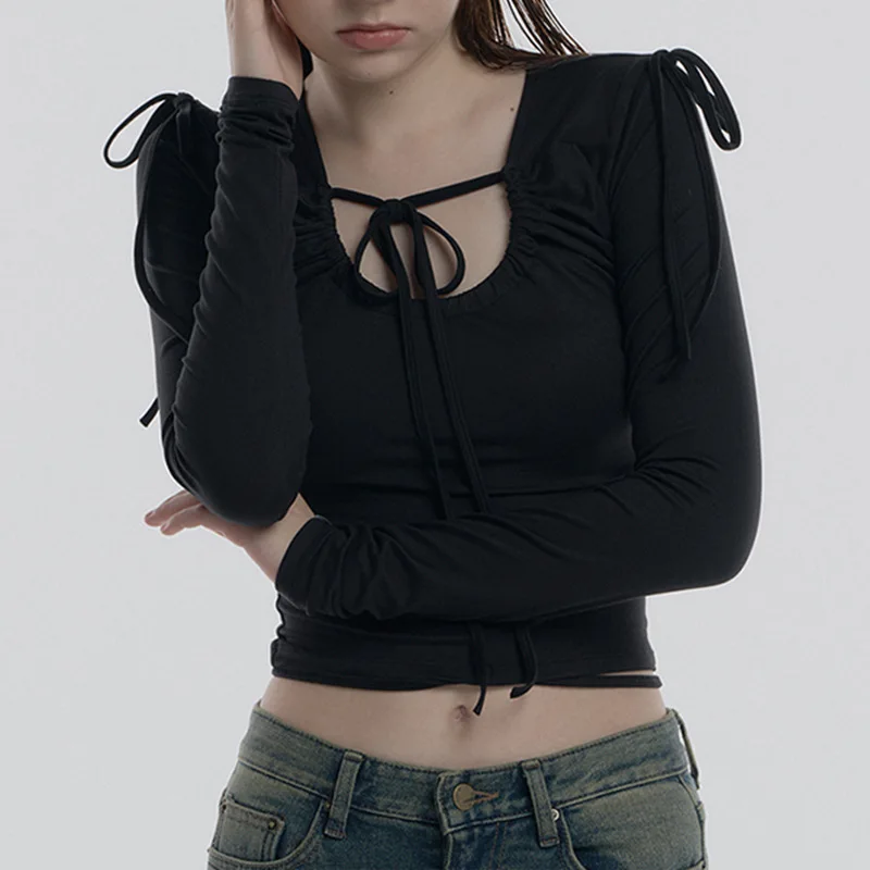 Lunivop Fashion Sexy Dark Punk T-shirt Women Streetwear U-neck Pleated Lace-up Short Slim Long-sleeved Top Emo Indie Clothes