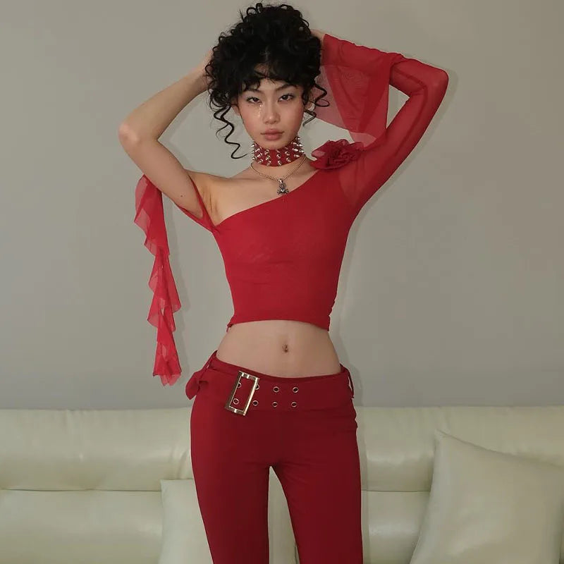 Lunivop Flare Sleeve Chic Elegant 3D Floral One Shoulder Lace-up Crop Top Y2K Solid Casual Slim Fit Party Streetwear Tank Top