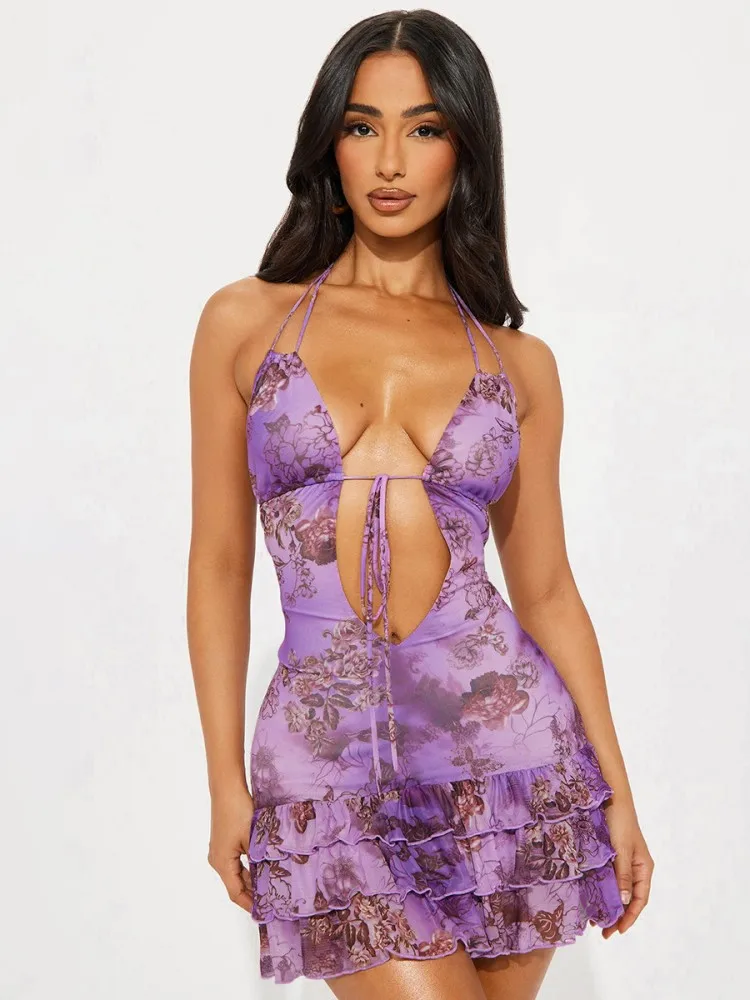 Lunivop Floral Print Halter Elegant Hollow Out Backless Ruffles Short Ball Dress Casual Clothing 2024 Fashion Y2K Streetwear