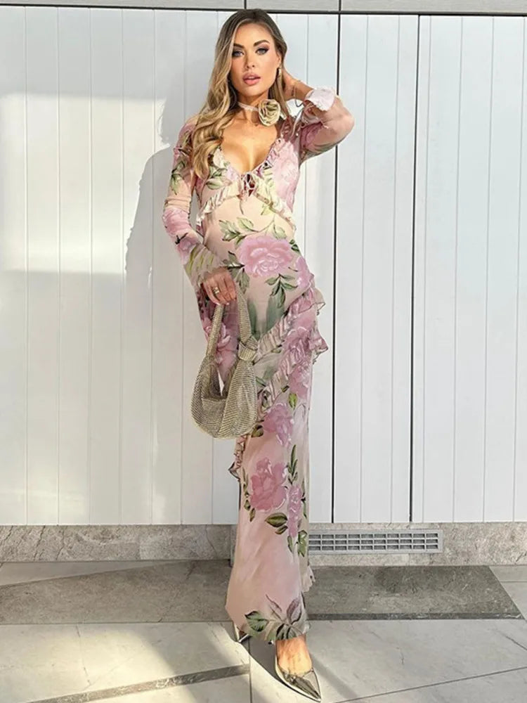 Lunivop Floral Print Long Sleeve Sexy Maxi Dress For Women Autumn New V Neck High Waist Ruffled Bodycon Elegant Long Dress