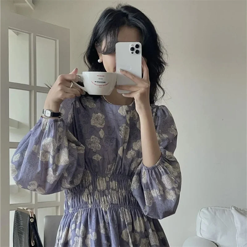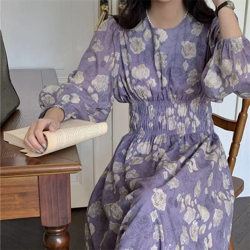 Lunivop French Floral Dress Women Autumn Elegant Long Puff Sleeve Round Neck Elastic Waist A-line Dresses Korean Clothing Fairy Vestidos