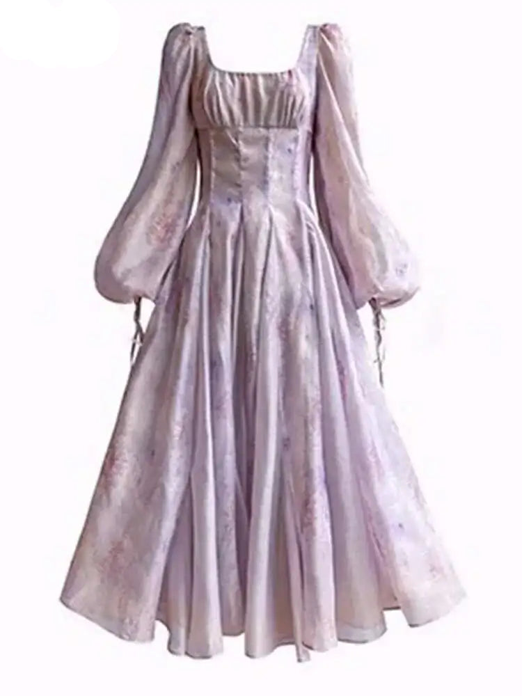 Lunivop French Printing Dresses For Women Square Collar High Waist Lantern Sleeve Elegant Dress Female Autumn 2025 New
