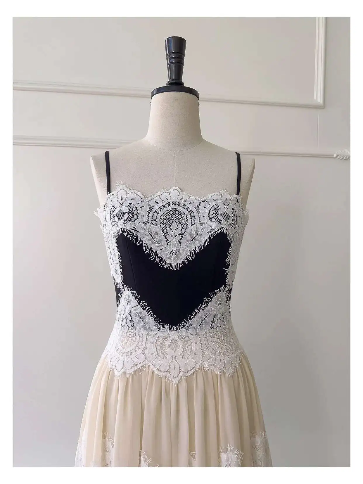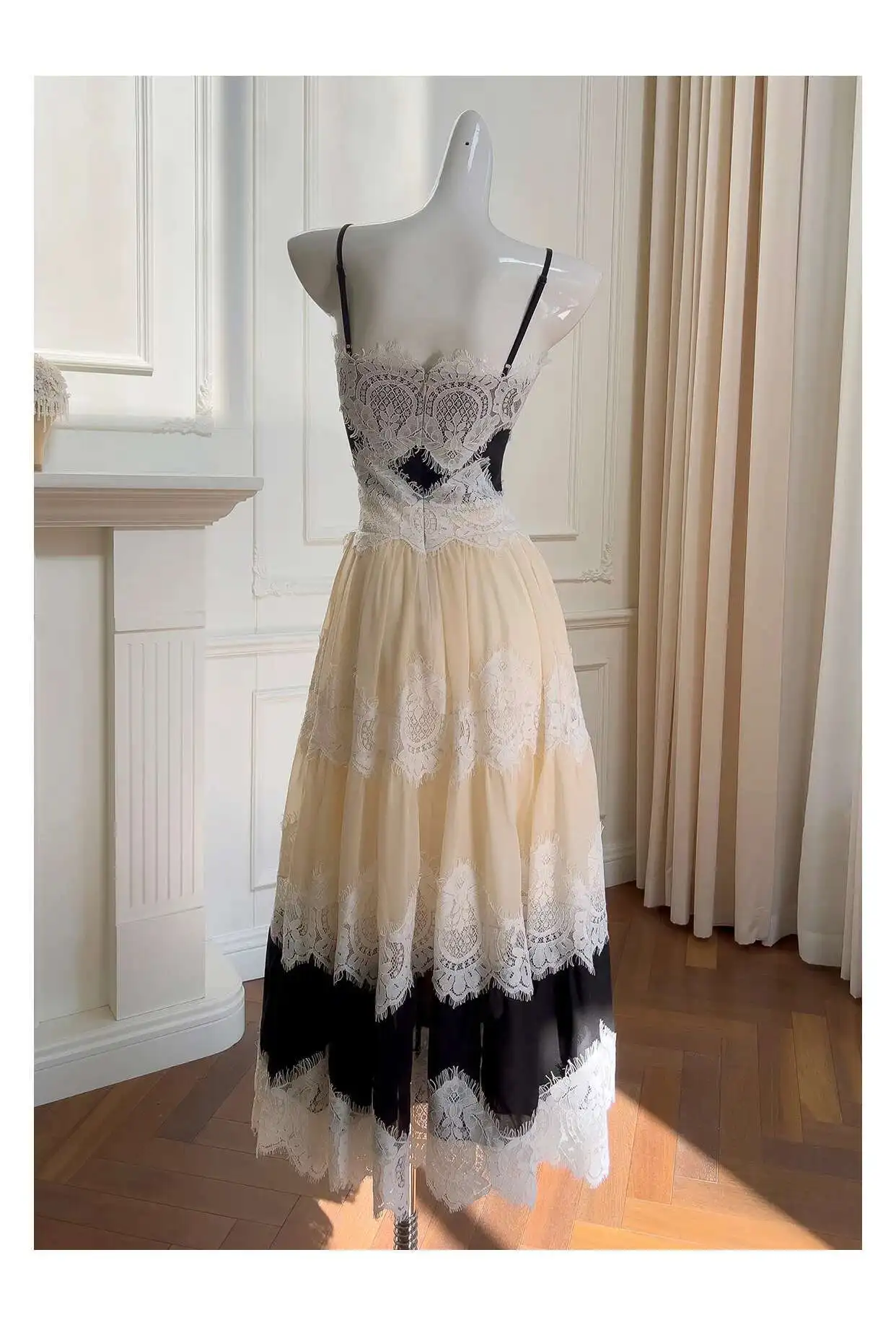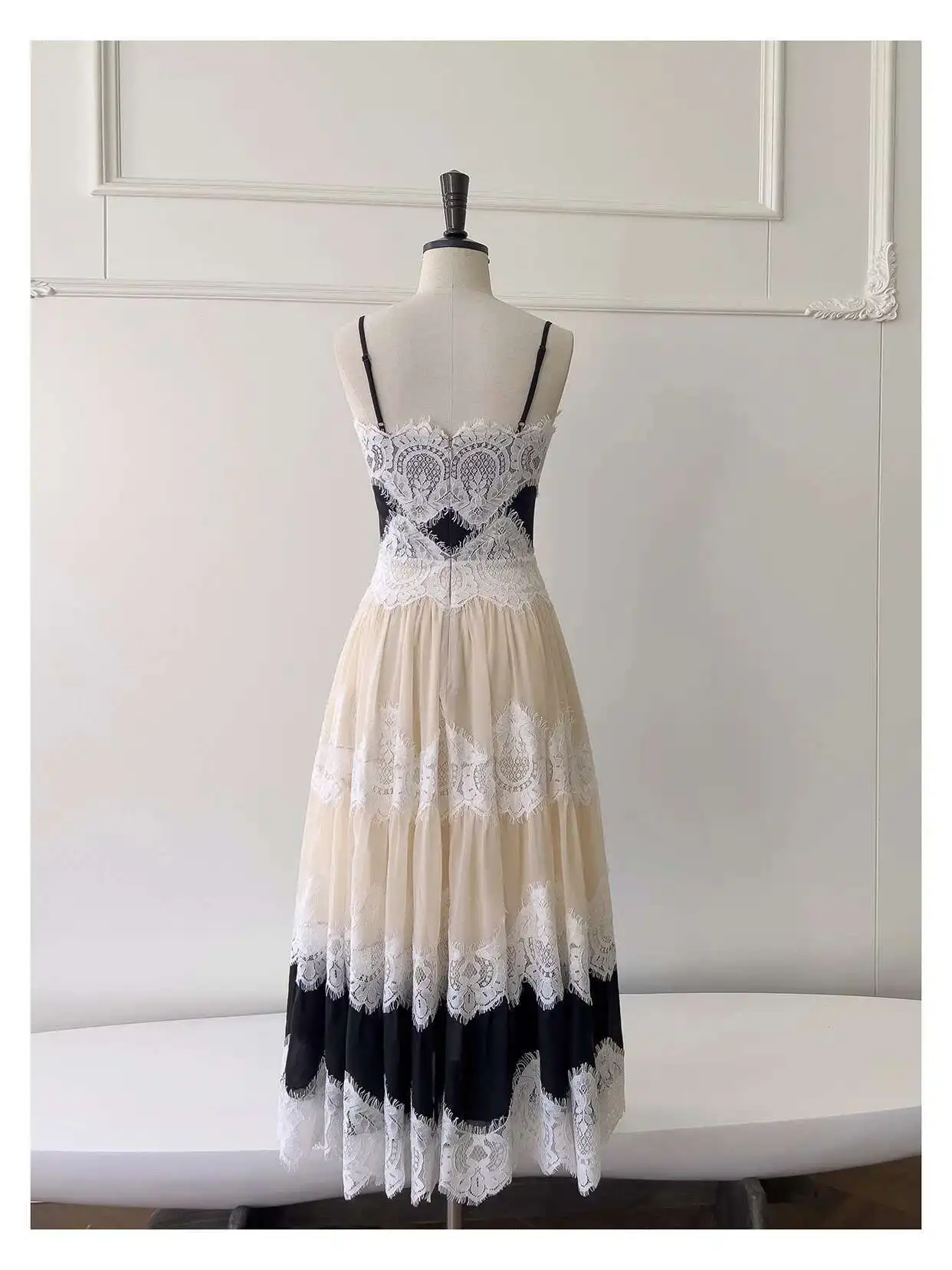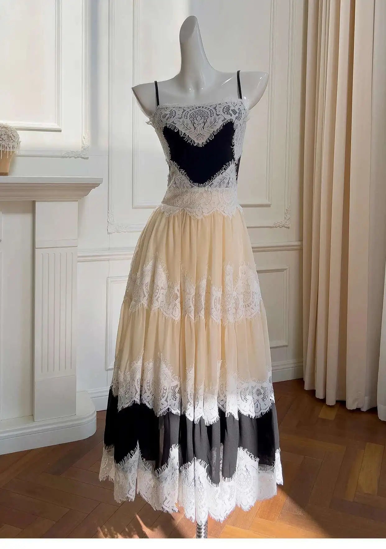 Lunivop French Style Lace Contrast Suspender Dress Spliced Sleeveless One Shoulder Evening Dresses Female 2025 Spring New