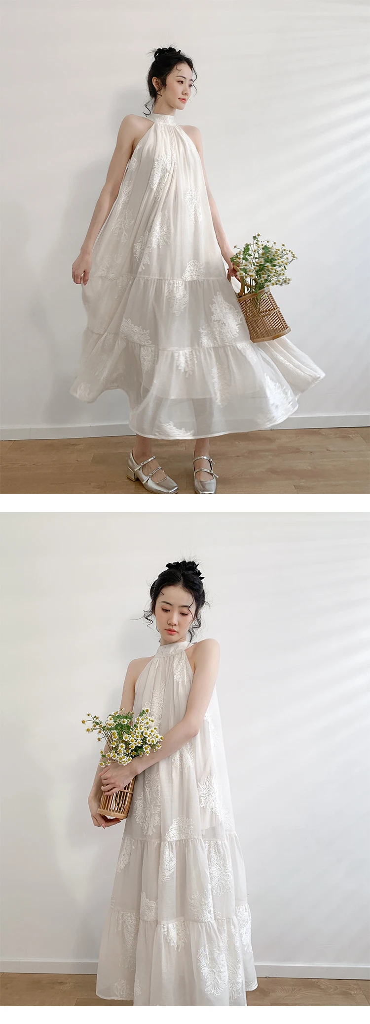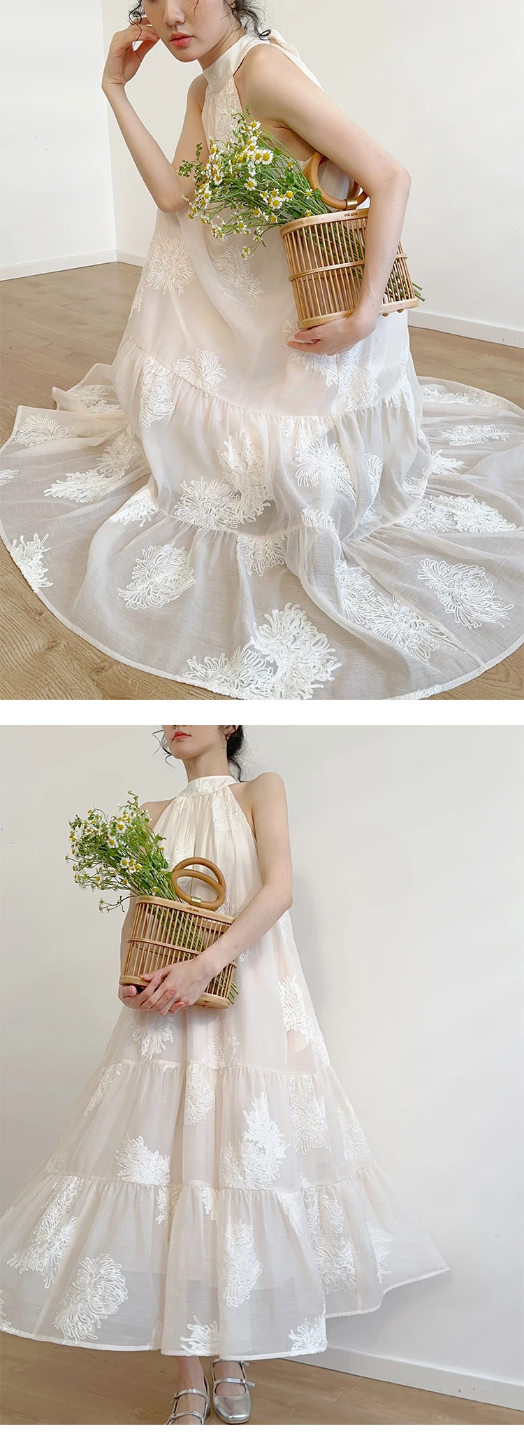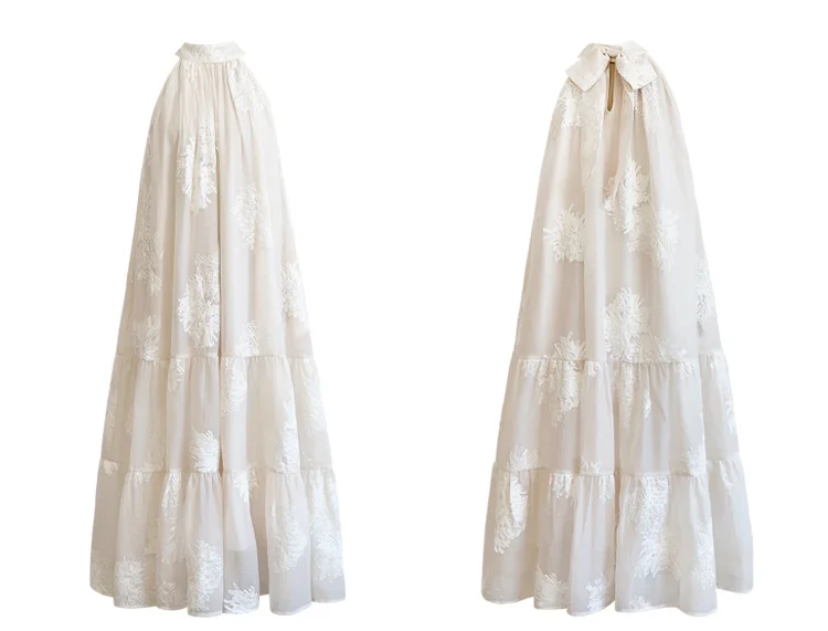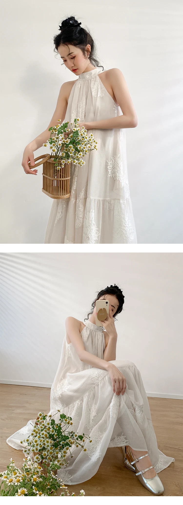 Lunivop French Vintage Apricot Embroidery Printed Dress Women Spring Summer Sleeveless Hanging Neck A-line Dress Ladies Midi Dresses