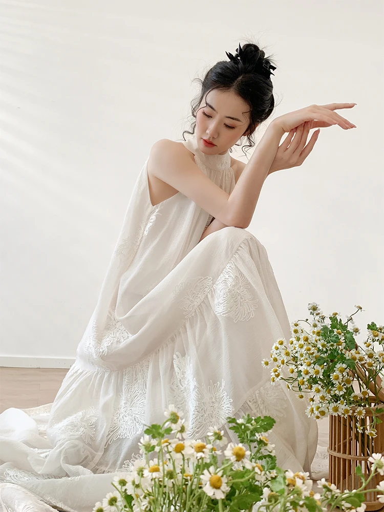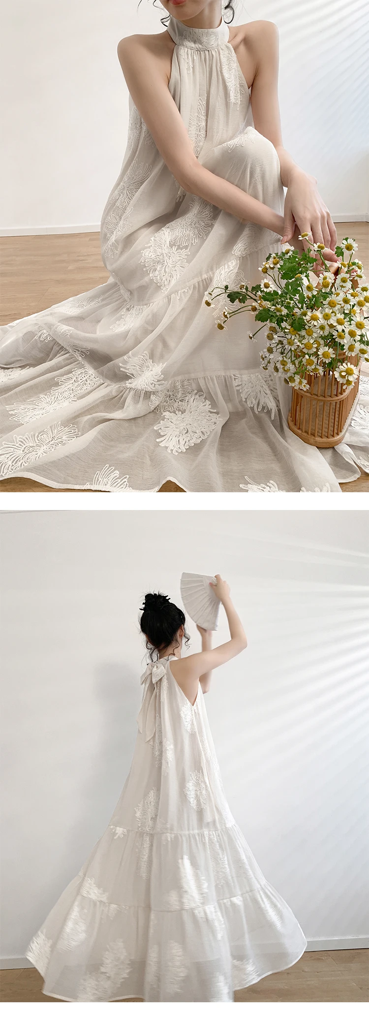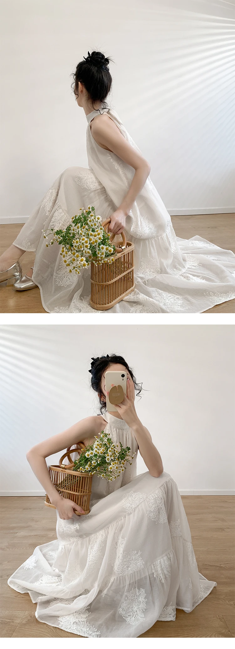 Lunivop French Vintage Apricot Embroidery Printed Dress Women Spring Summer Sleeveless Hanging Neck A-line Dress Ladies Midi Dresses