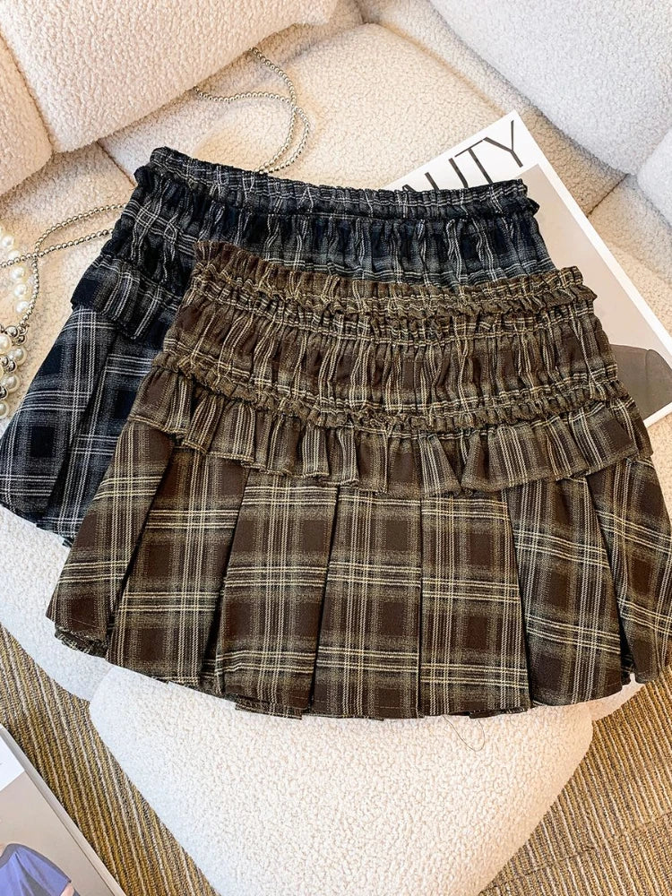 Lunivop French Vintage Skirt Gyaru Plaid Ruffles Patchwork Pleated Design High Waist Mini Skirts Female Slim All Match Women's Clothing