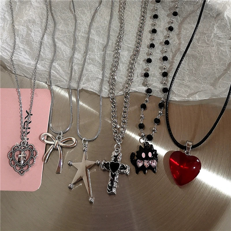 Lunivop Goth Cute Black Cat Star Cross Bowknot Pendant Beaded Chain Necklace For Women Girl Charm Y2K Cool 2000s EMO Jewelry Accessories