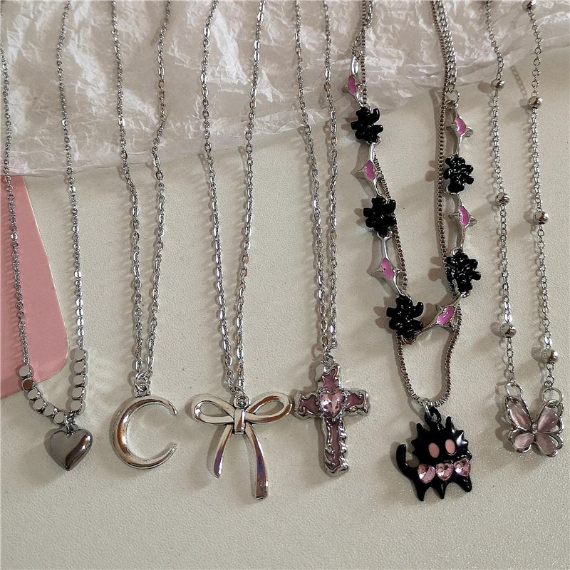 Lunivop Goth Harajuku Cute Pink Cross Heart Bowknot Cat Moon Pendant Chain 90s Aesthetic Necklace Kpop Girl EMO Y2k Grunge Accessories