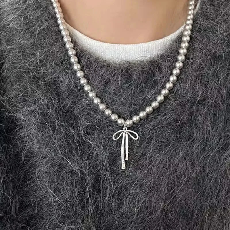Lunivop Goth Harajuku Cute Y2K Aesthetic Bowknot Pendant Grey Pearl Beaded Rope Chain Necklace for Girl Choker Cool 90s EMO Accessories