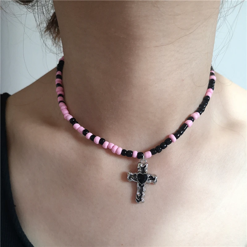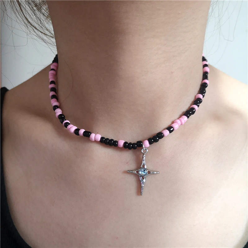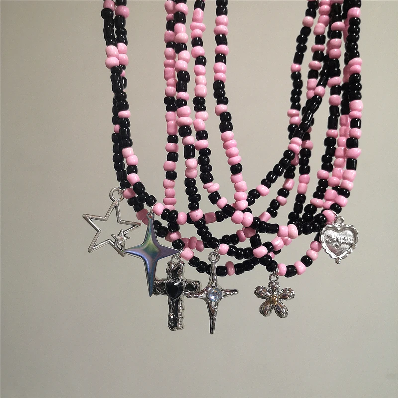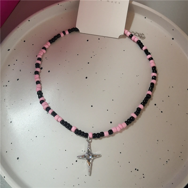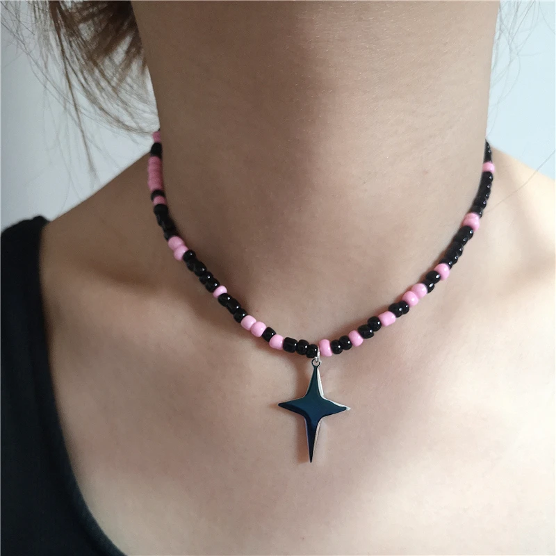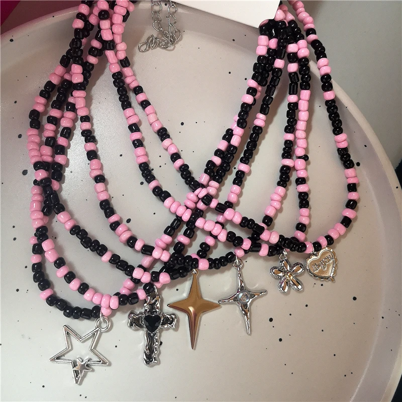 Lunivop Goth Y2K Cute Star Cross Pendant Black Pink Beaded Chain Necklace Egirl 2000s EMO Harajuku Aesthetic Grunge Jewelry Accessories