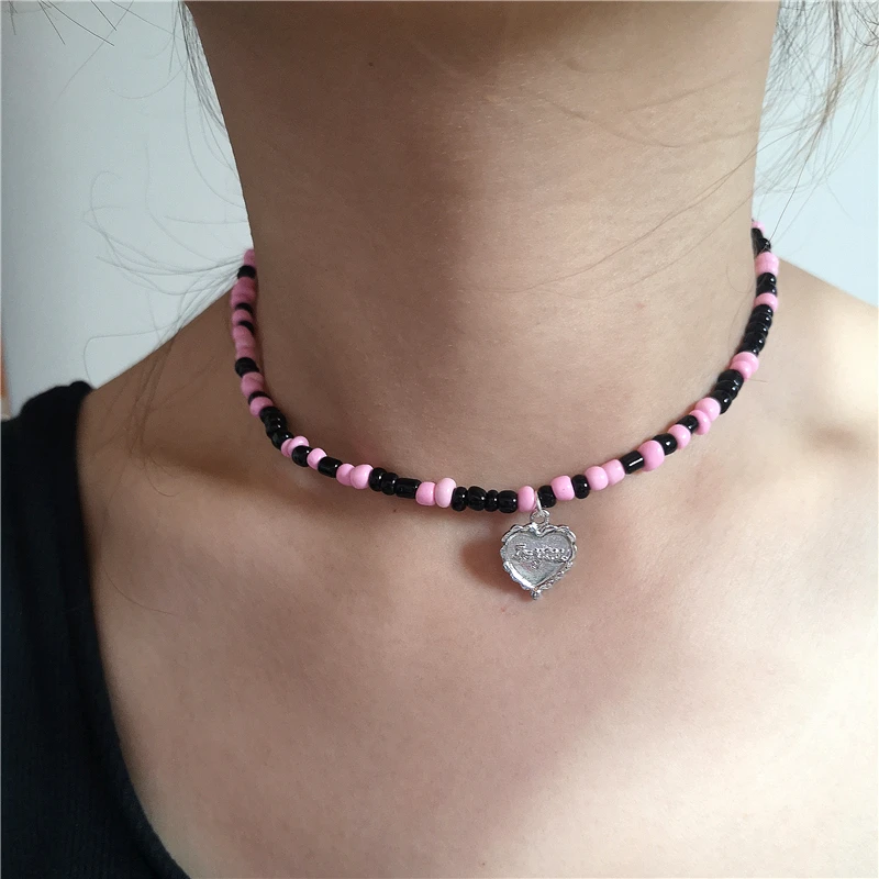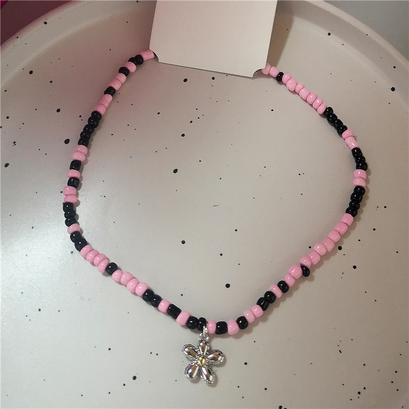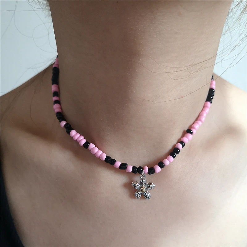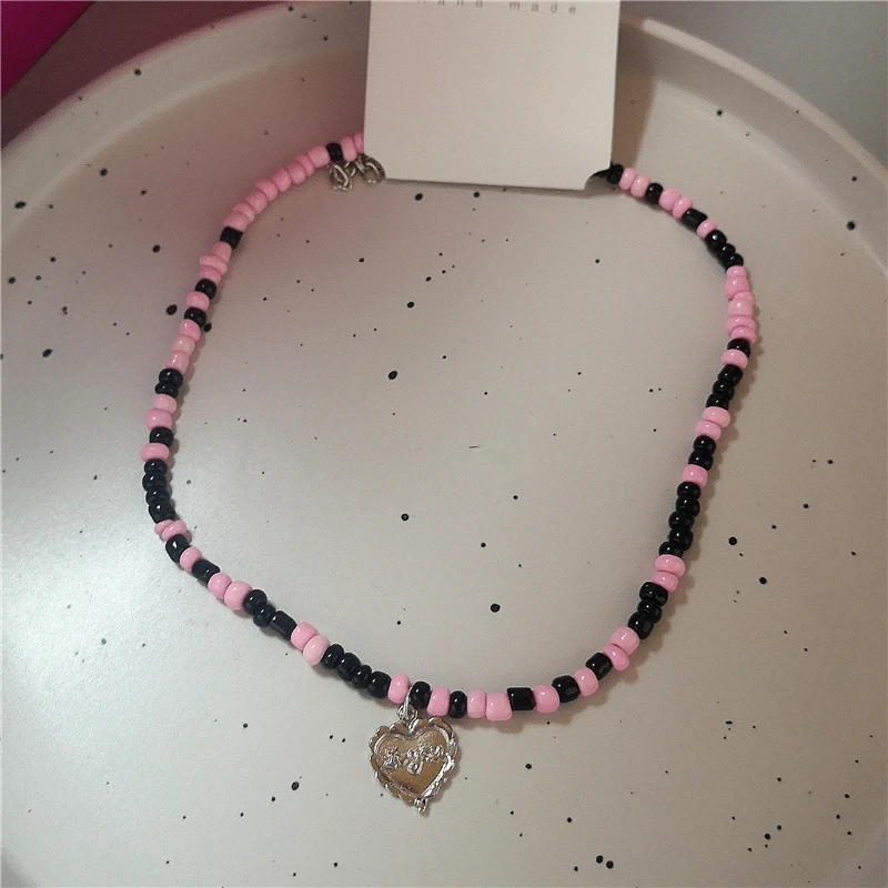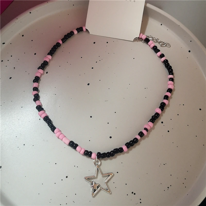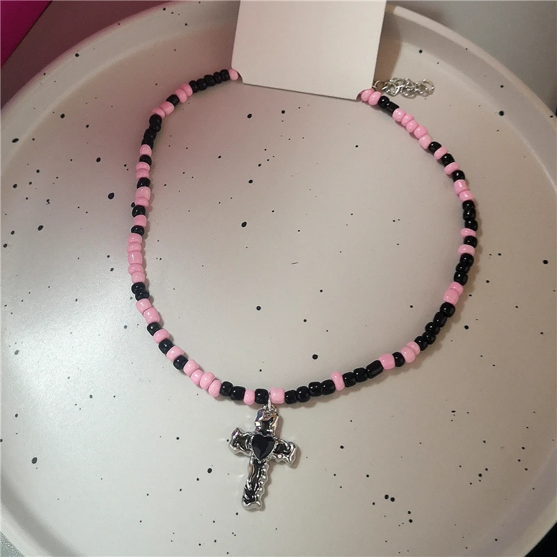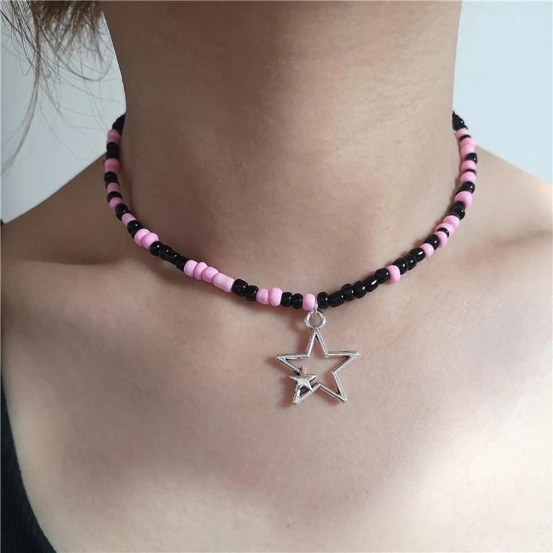 Lunivop Goth Y2K Cute Star Cross Pendant Black Pink Beaded Chain Necklace Egirl 2000s EMO Harajuku Aesthetic Grunge Jewelry Accessories