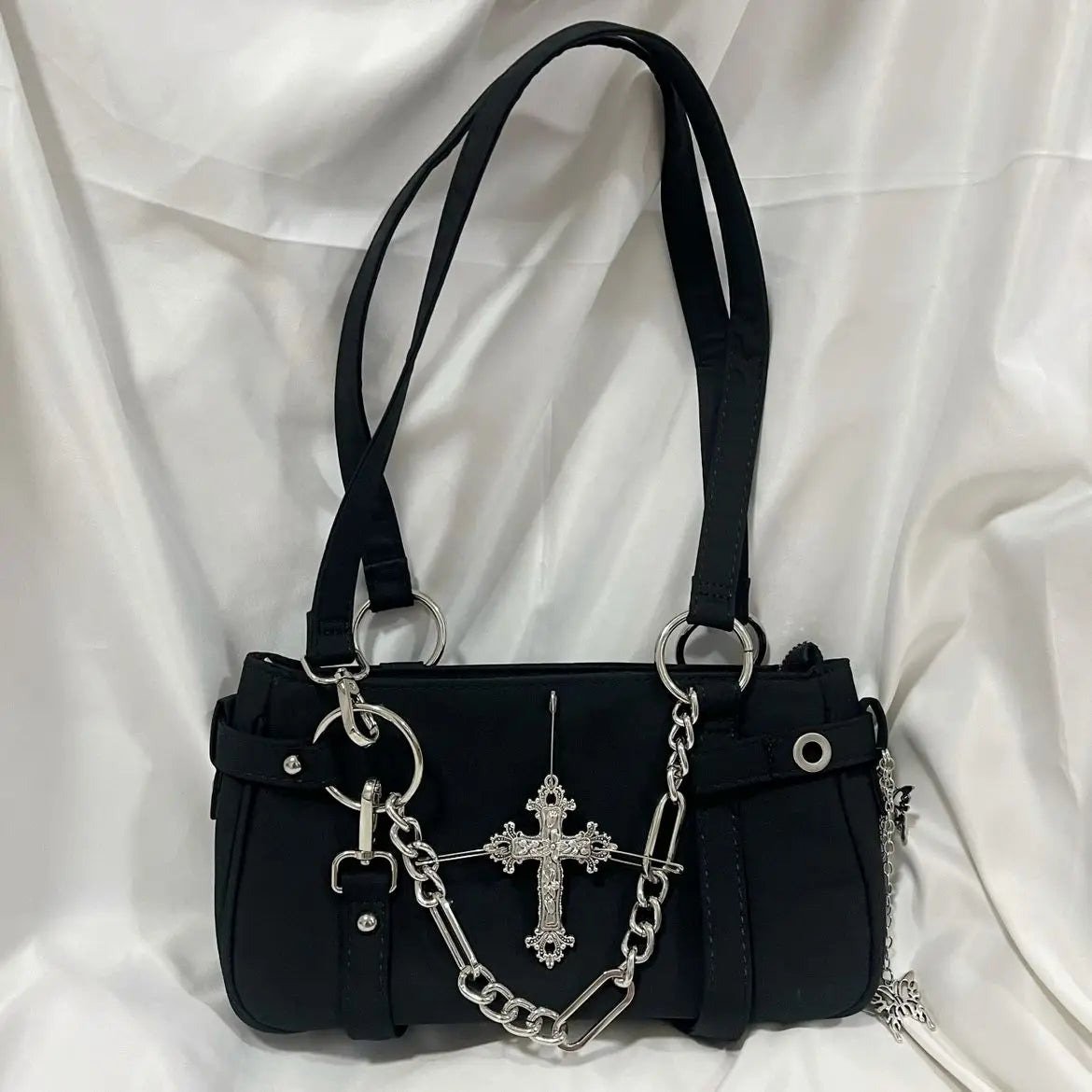 Lunivop Gothic Cross Y2k Bag Women Vintage Grunge Punk Chain Casual Shoulder Bag Female Retro Moto Biker Black Handbag Aesthetic