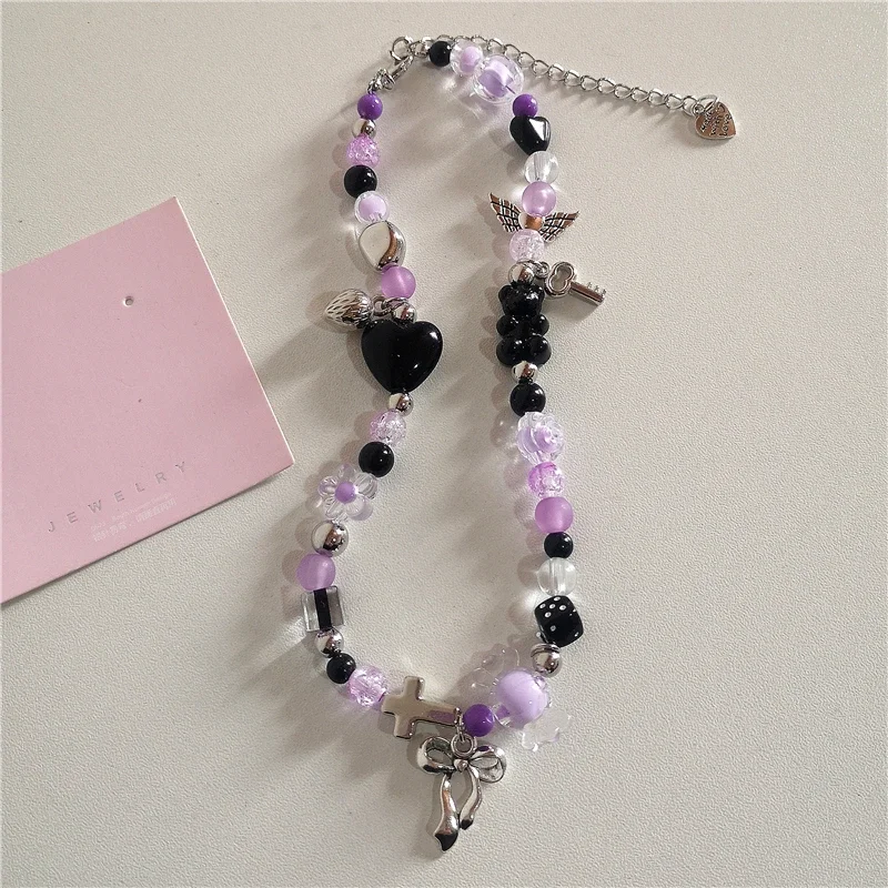 Lunivop Gothic Cute Charms Bow Cross Heart Wings Pendant Pink Beaded Choker Necklace Girl Y2K EMO 2000s Jewelry Accessories