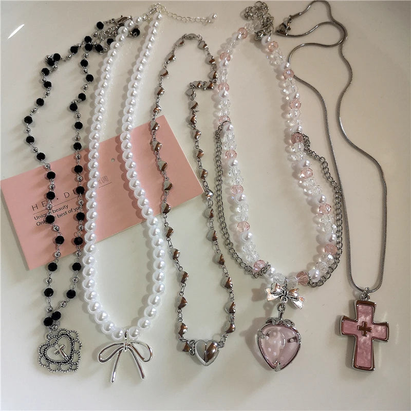 Lunivop Gothic Vintage Pink Cross Strawberry BowTassel Pendant Pearl Beaded Snake Chain Necklace Women Y2K 2000s EMO Jewelry Accessories