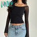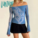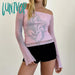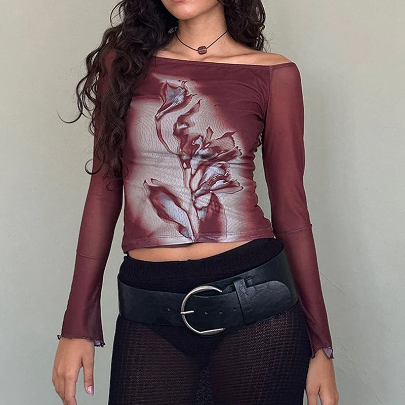 Lunivop Graphic Grunge Print Mesh Sheer T-shirt Women Coquette Off Shoulder Full Sleeve Tees Y2k Aesthetic Slim Fit Backless Crop Tops