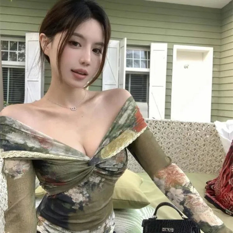 Lunivop Green Oil Painting Print Vintage Tops Mujer 2025 Summer New Slim Fit T-shirt for Women Sexy Off Shoulder Long Sleeve Tee Shirt