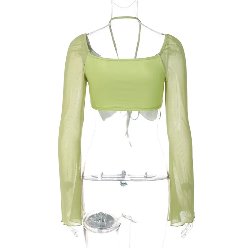 Lunivop Halter Butterfly Print Long Sleeve High Waist Crop Top Tshirts Summer Y2K Streetwear 2024 Fashion Casual Clothes