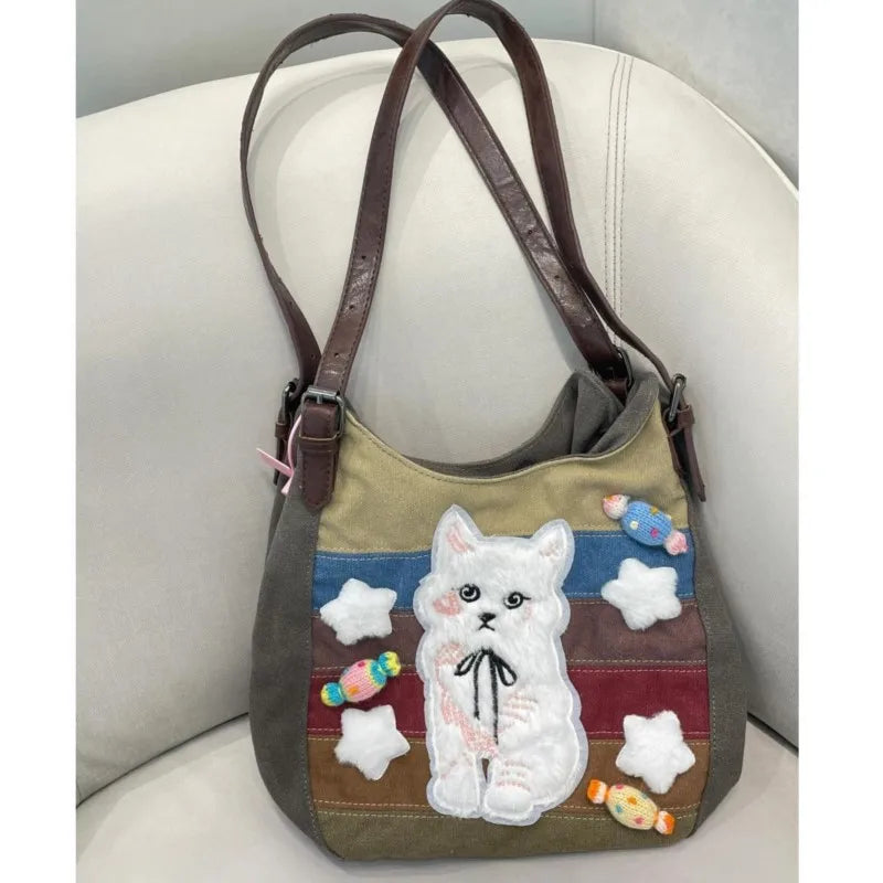 Lunivop Harajuku Cat Shoulder Bags Women Vintage Embroidery Patchwork Casual Tote Bag Handbag Female Sweet Y2k Bags Aesthetic