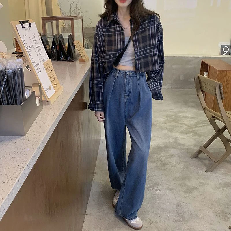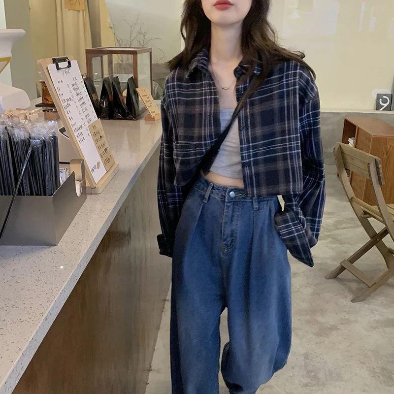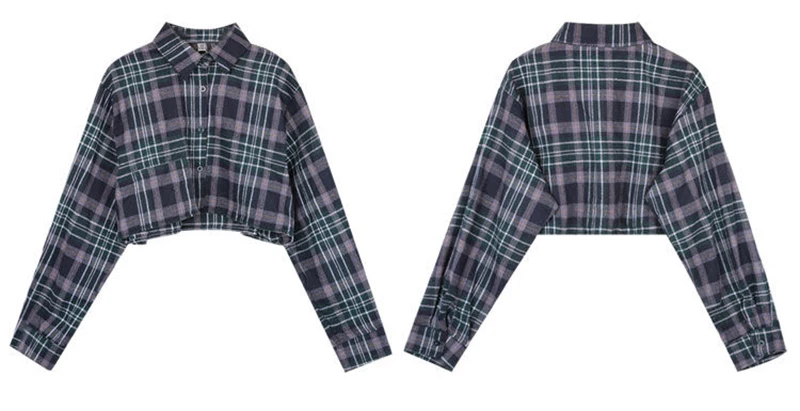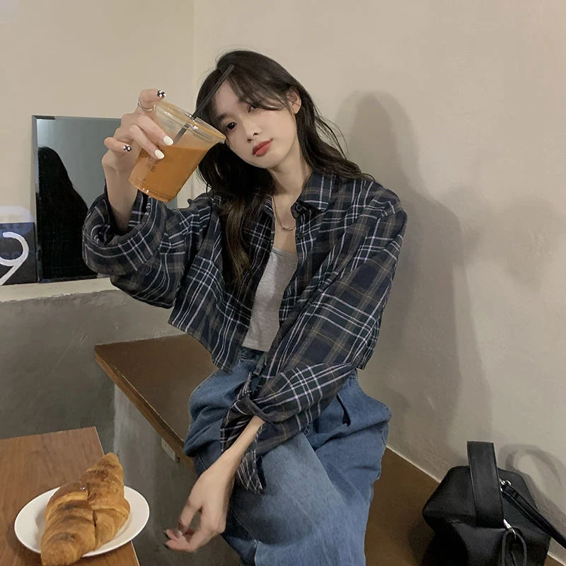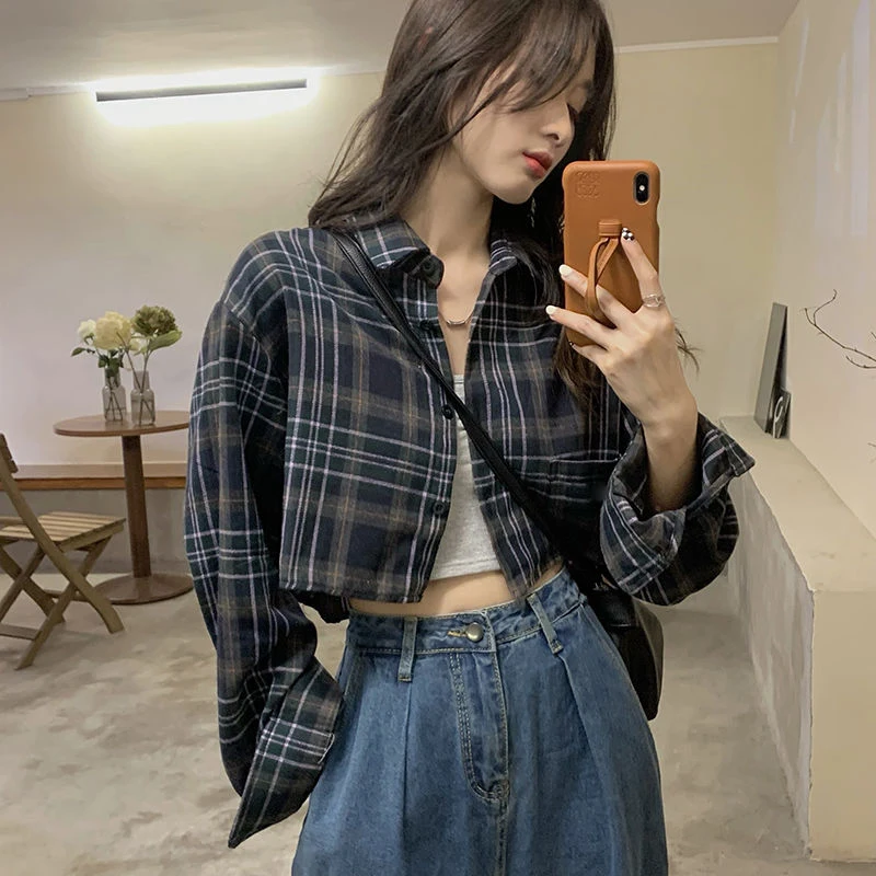 Lunivop Harajuku Crop Plaid Shirts Women Vintage Long Sleeve Loose Sunscreen Blouses Korean Fashion Casual All Match Top Thin Coat