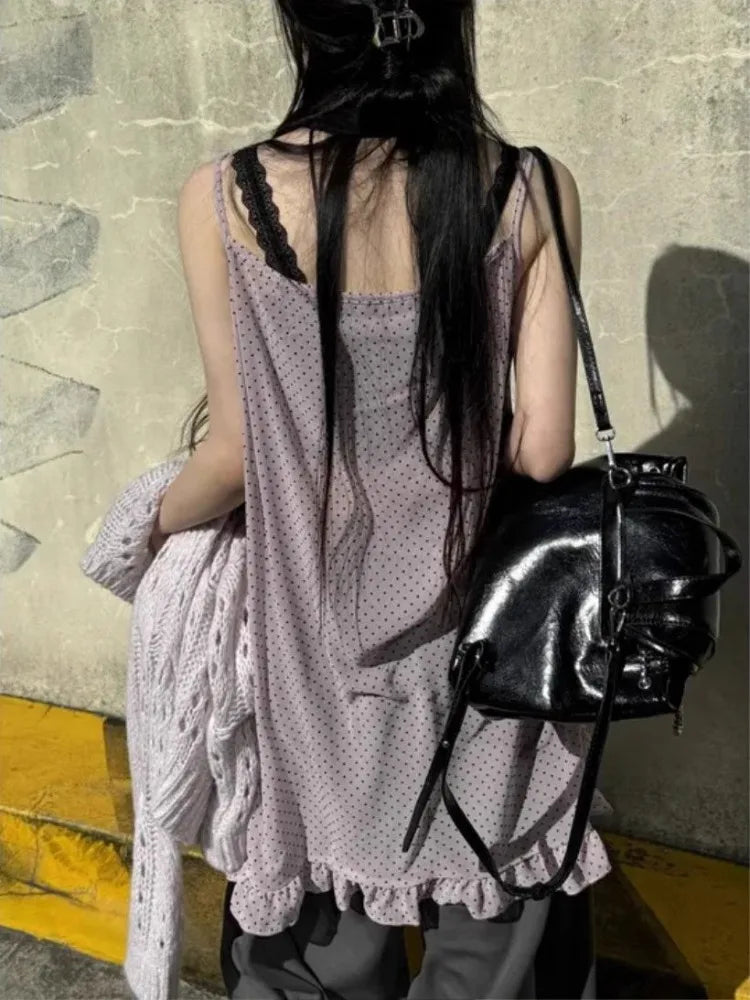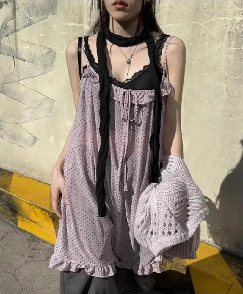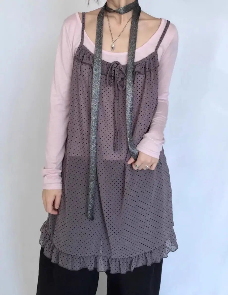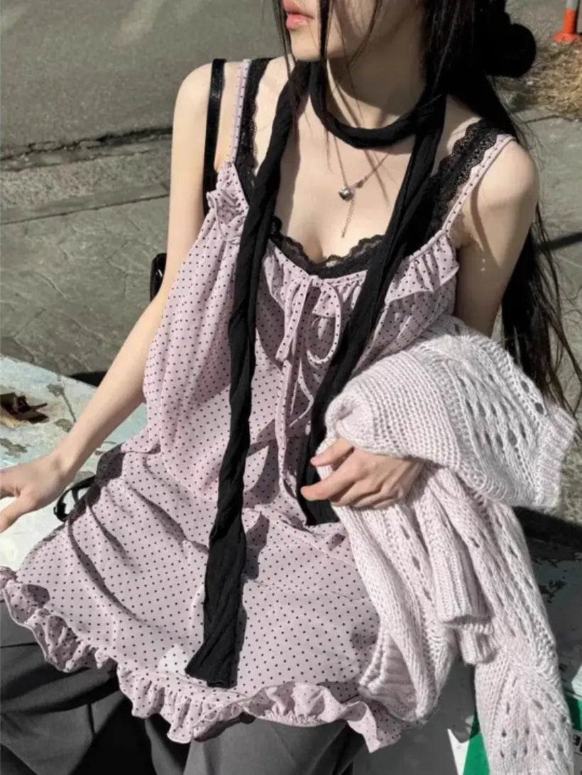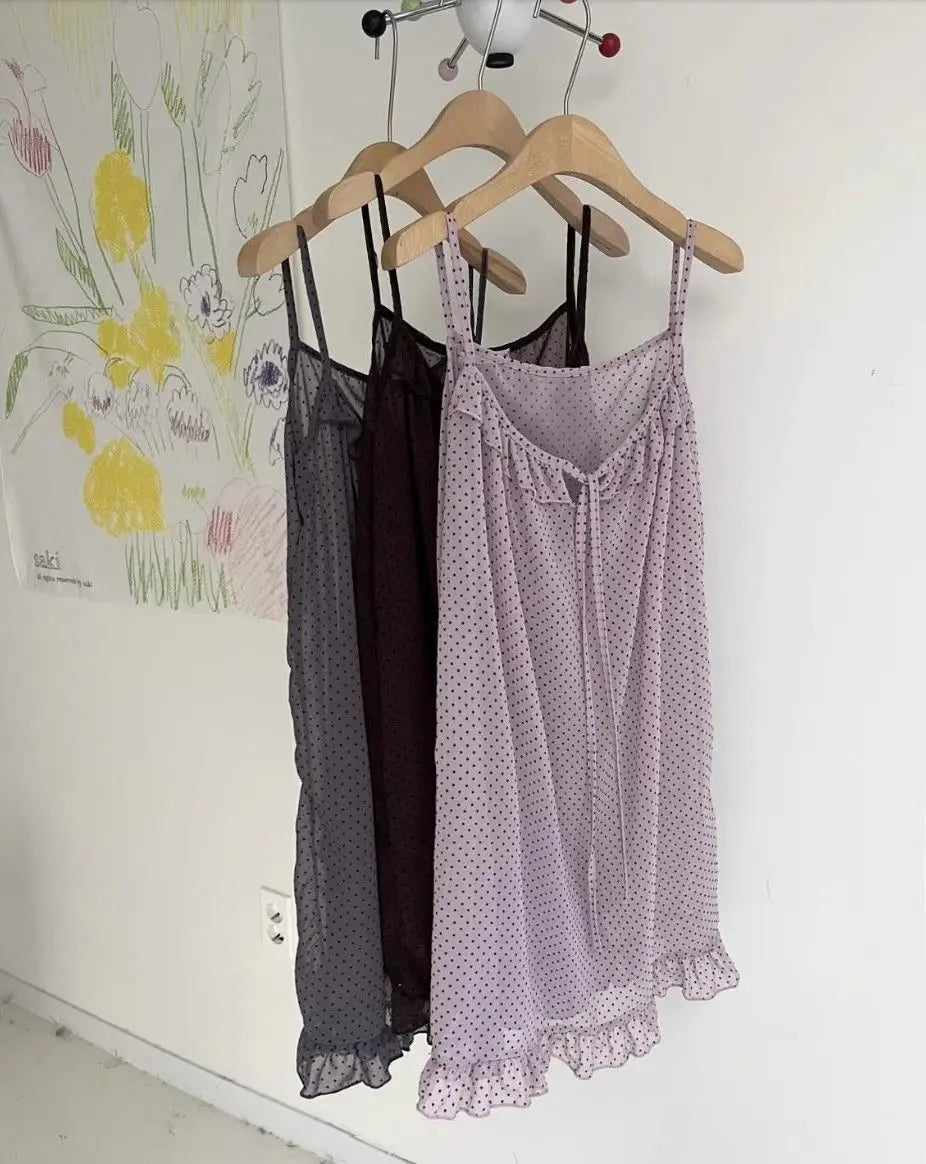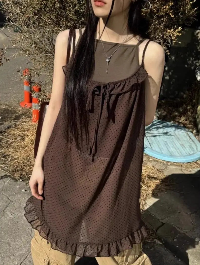 Lunivop Harajuku Japanese Style Tank Tops Women Vintage Polka Dot Ruffle Sleeveless Mesh Dress Sexy See-through Layered Wear
