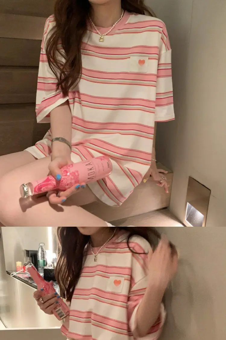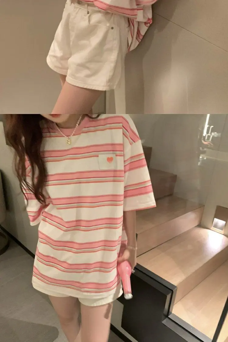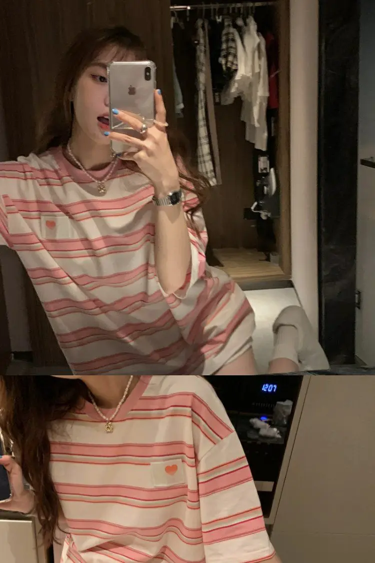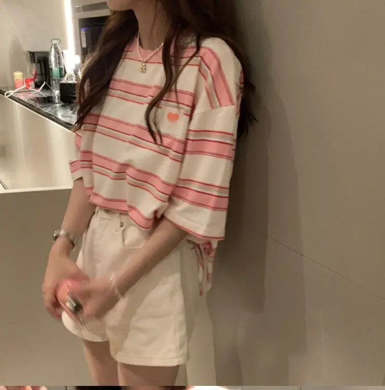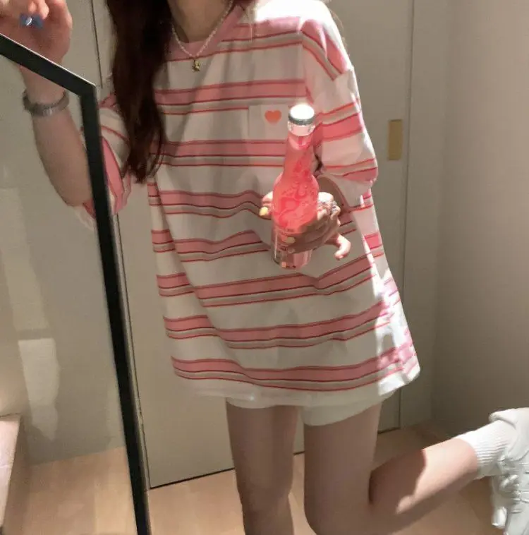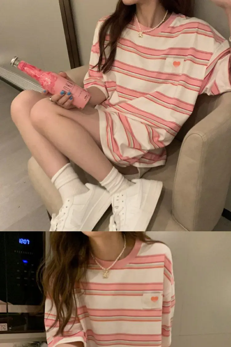 Lunivop Harajuku Kawaii Pink Striped T-shirt Short Sleeve T Shirt for Women's Cute Tshirt Streetwear Tops Tee Teenage Girl Clothing
